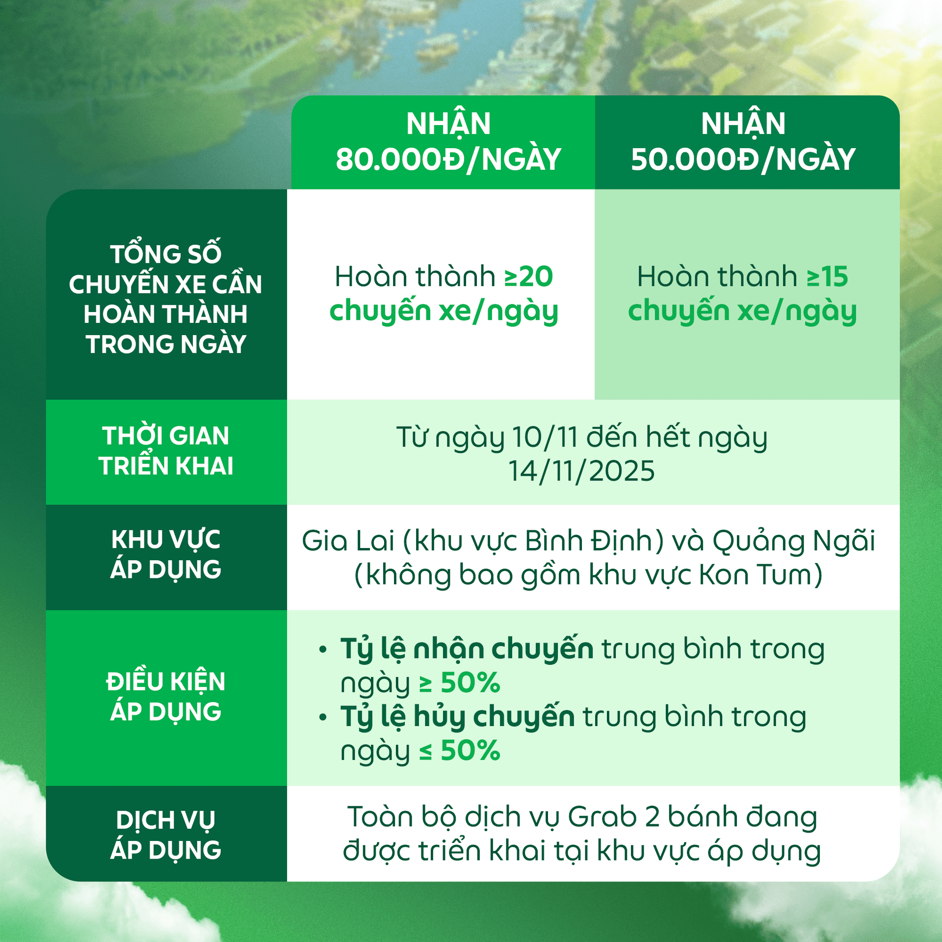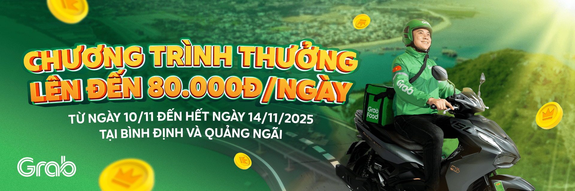 Grab 2 bánh | Chương trình thưởng lên đến 80.000đ/ngày từ ngày 10/11 đến hết ngày 14/11/2025 tại Bình Định và Quảng Ngãi