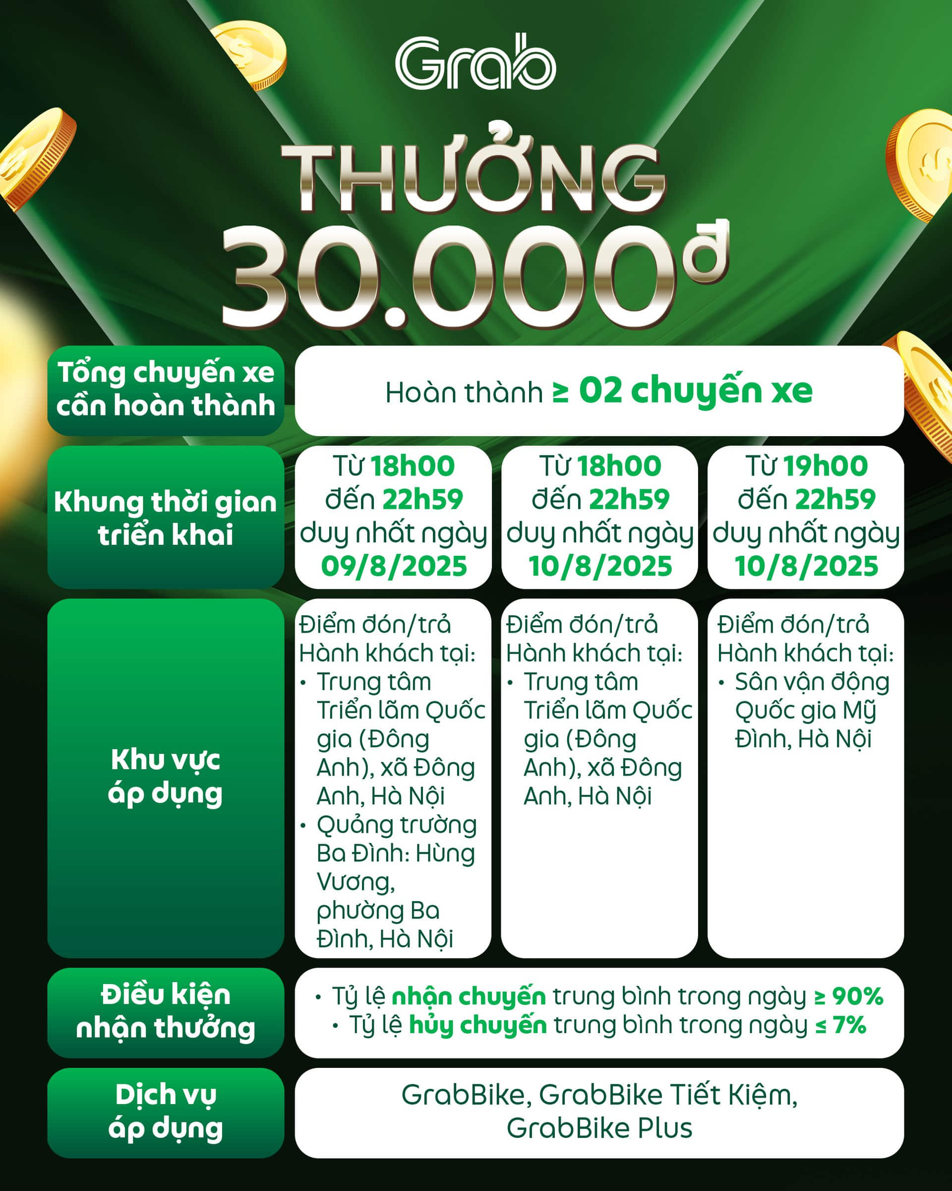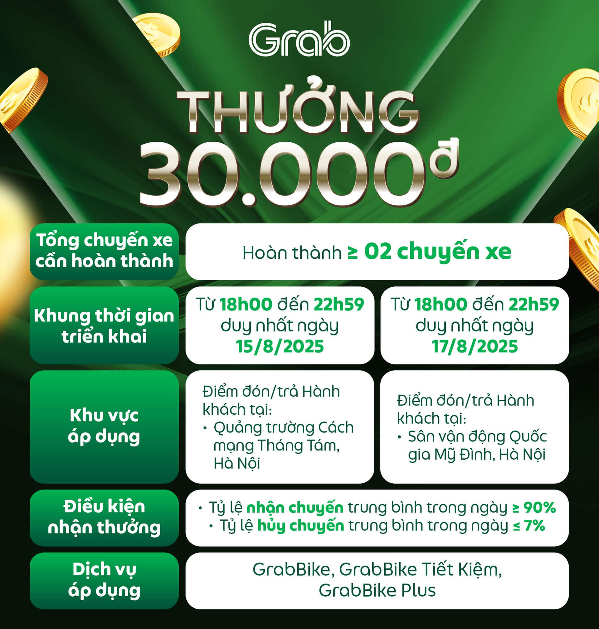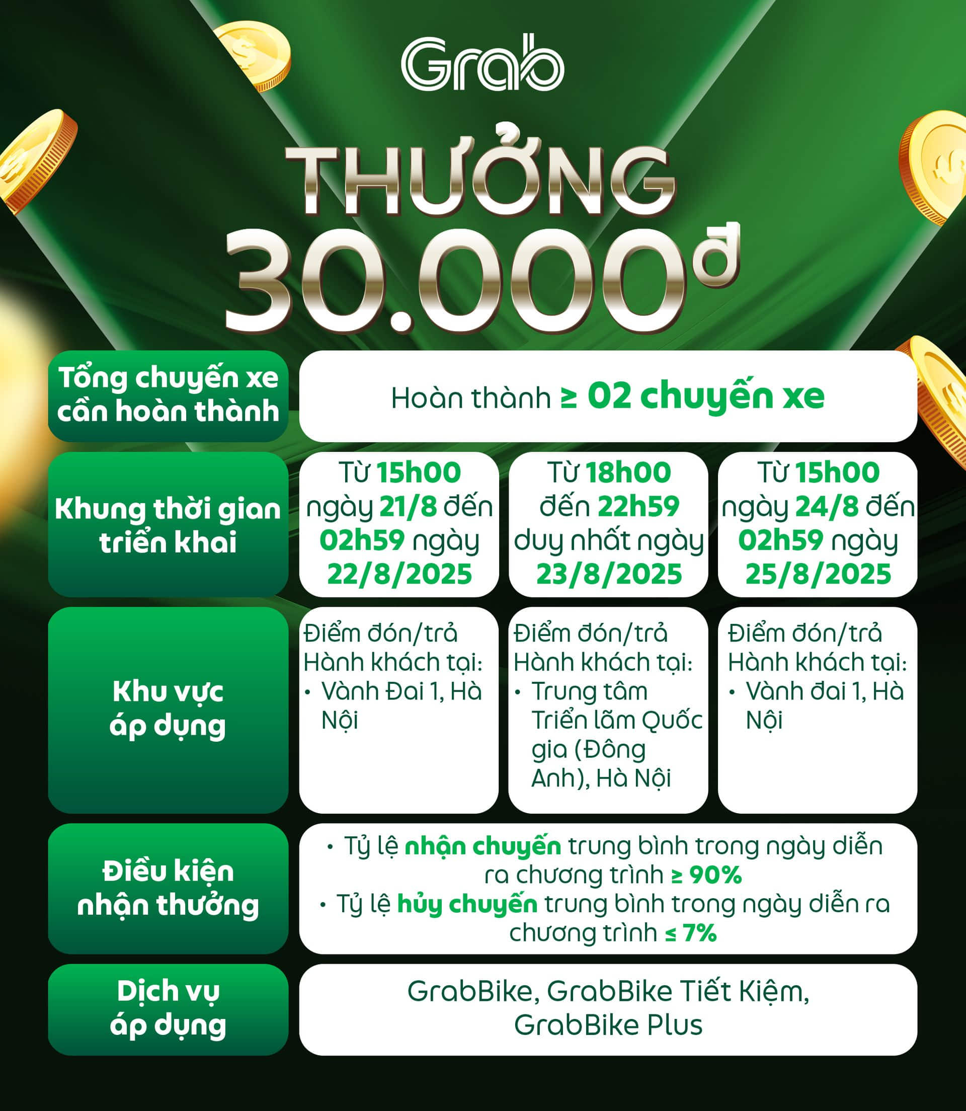 Nhằm giúp Đối tác có thêm cơ hội gia tăng thu nhập và đáp ứng nhu cầu di chuyển của Hành khách, Grab triển khai các chương trình thưởng khi hoàn thành chuyến xe có điểm đón/trả Hành khách tại khu vực áp dụng trong tháng 8/2025. Chi tiết như sau: