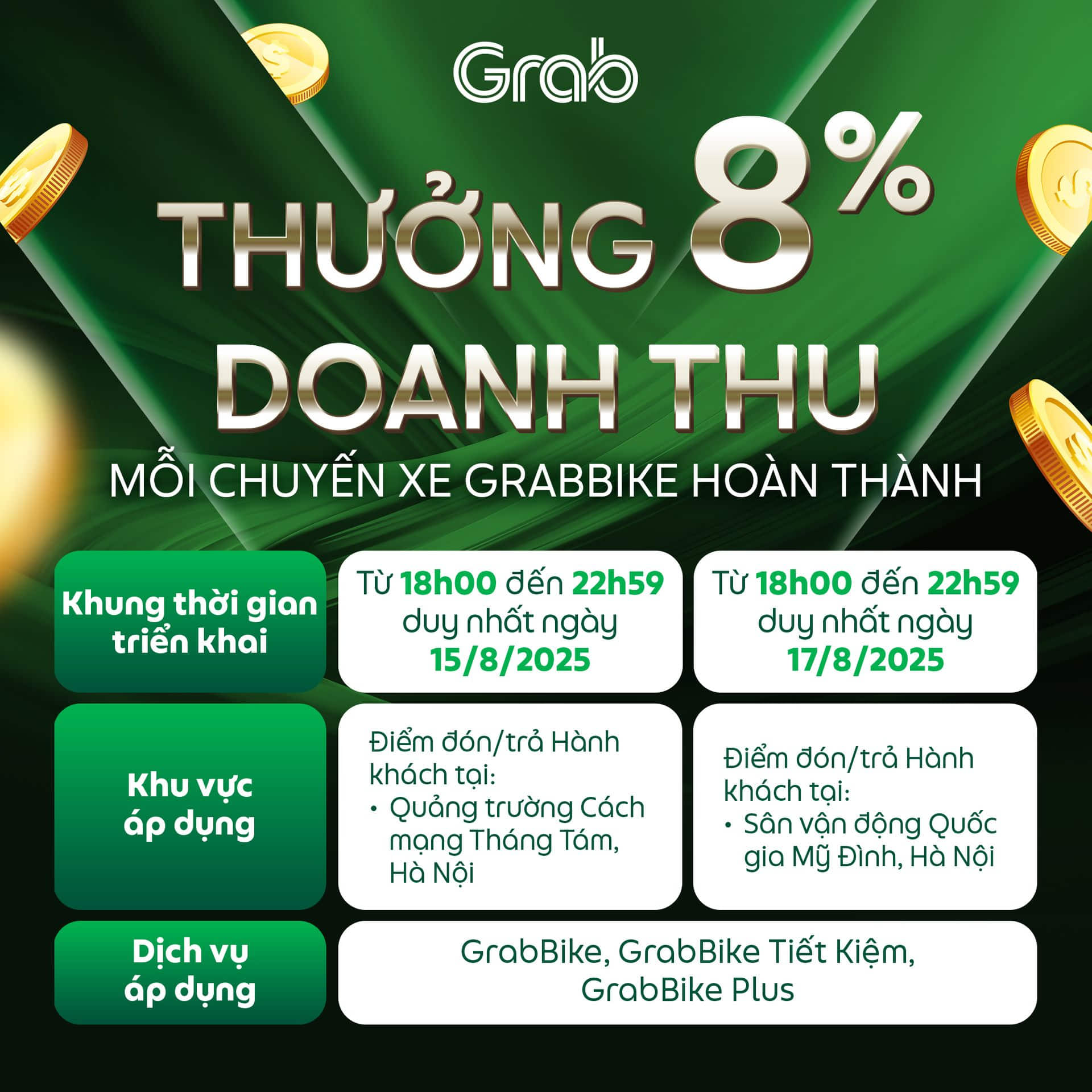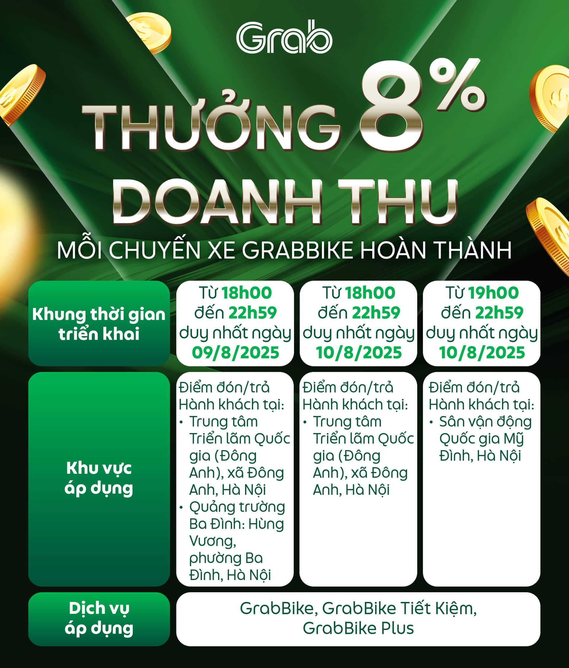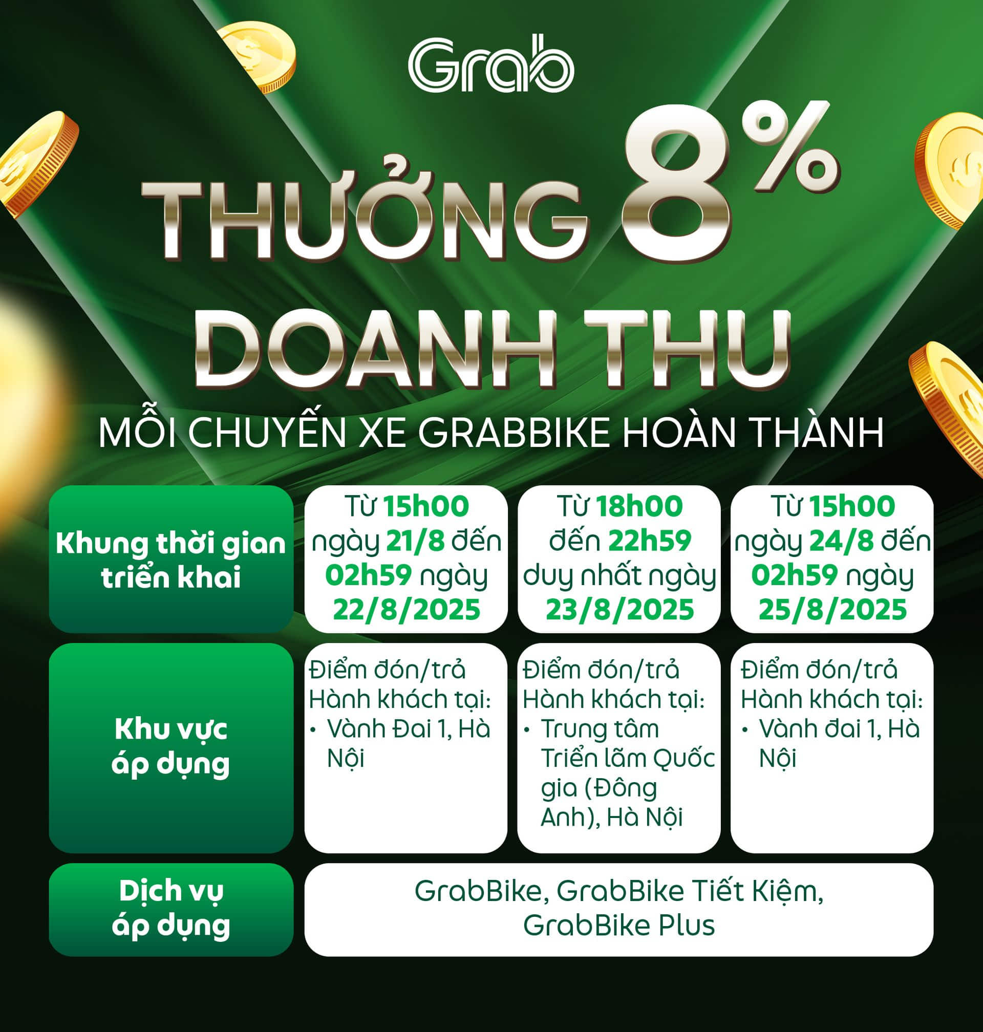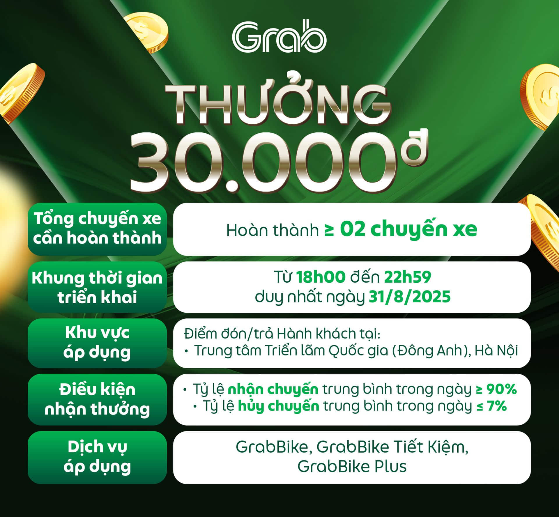Nhằm giúp Đối tác có thêm cơ hội gia tăng thu nhập và đáp ứng nhu cầu di chuyển của Hành khách, Grab triển khai các chương trình thưởng khi hoàn thành chuyến xe có điểm đón/trả Hành khách tại khu vực áp dụng trong tháng 8/2025. Chi tiết như sau: