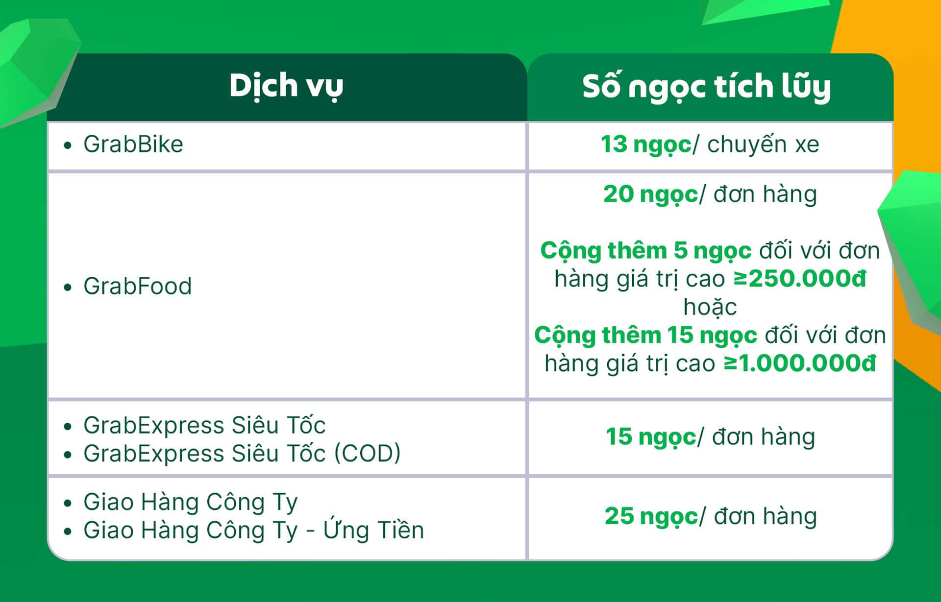Mỗi chuyến xe hoàn thành sẽ được quy đổi thành số ngọc thưởng tương ứng trên ứng dụng Grab Driver dựa vào bảng bên dưới: