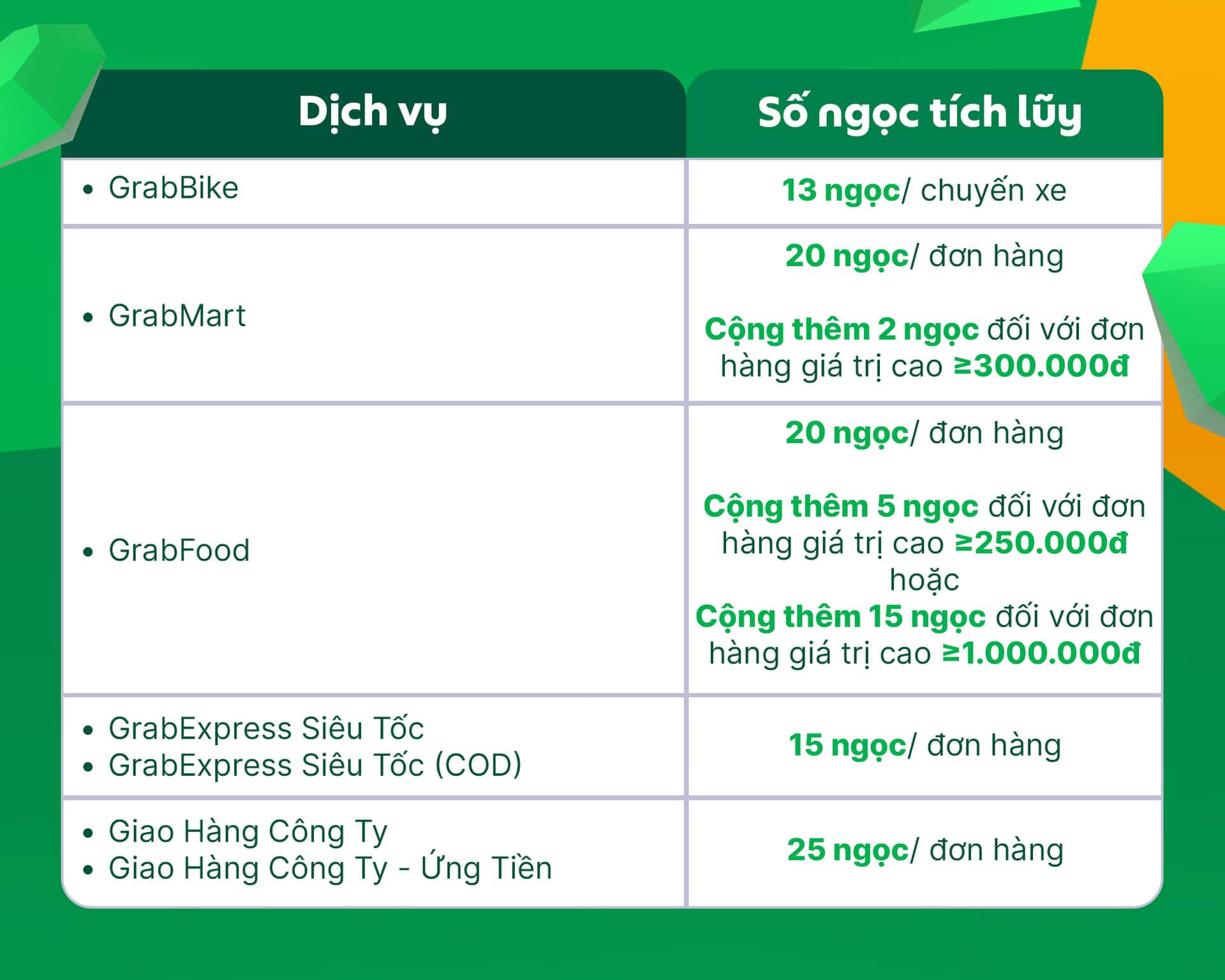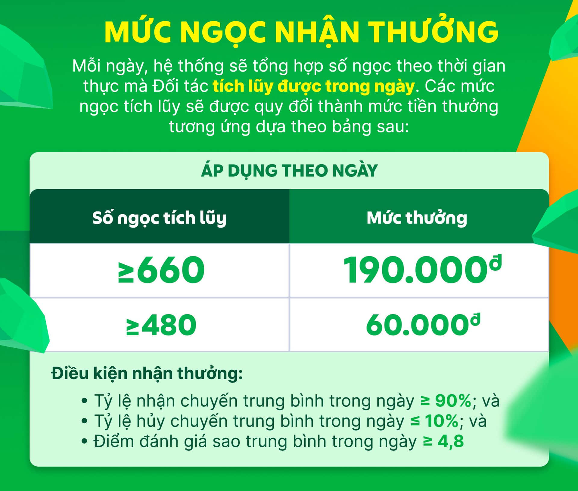Mỗi chuyến xe hoàn thành sẽ được quy đổi thành số ngọc thưởng tương ứng trên ứng dụng Grab Driver dựa vào bảng bên dưới: