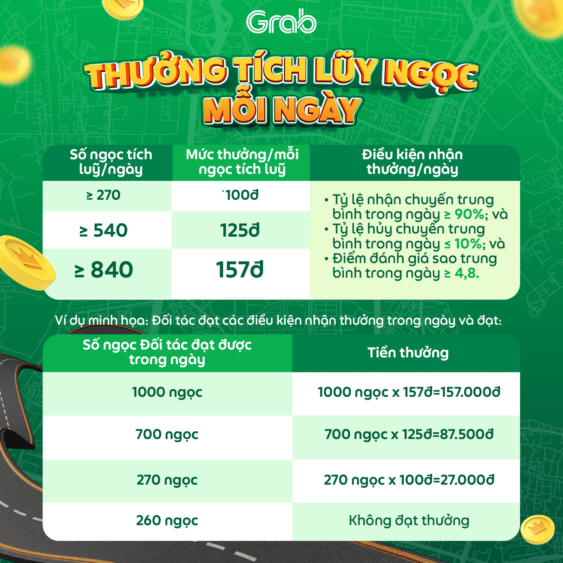 Điều kiện nhận thưởng của chương trình có thể thay đổi tùy theo quyết định của Grab vào từng thời điểm cụ thể và sẽ được thông báo đến Đối tác trước khi áp dụng.