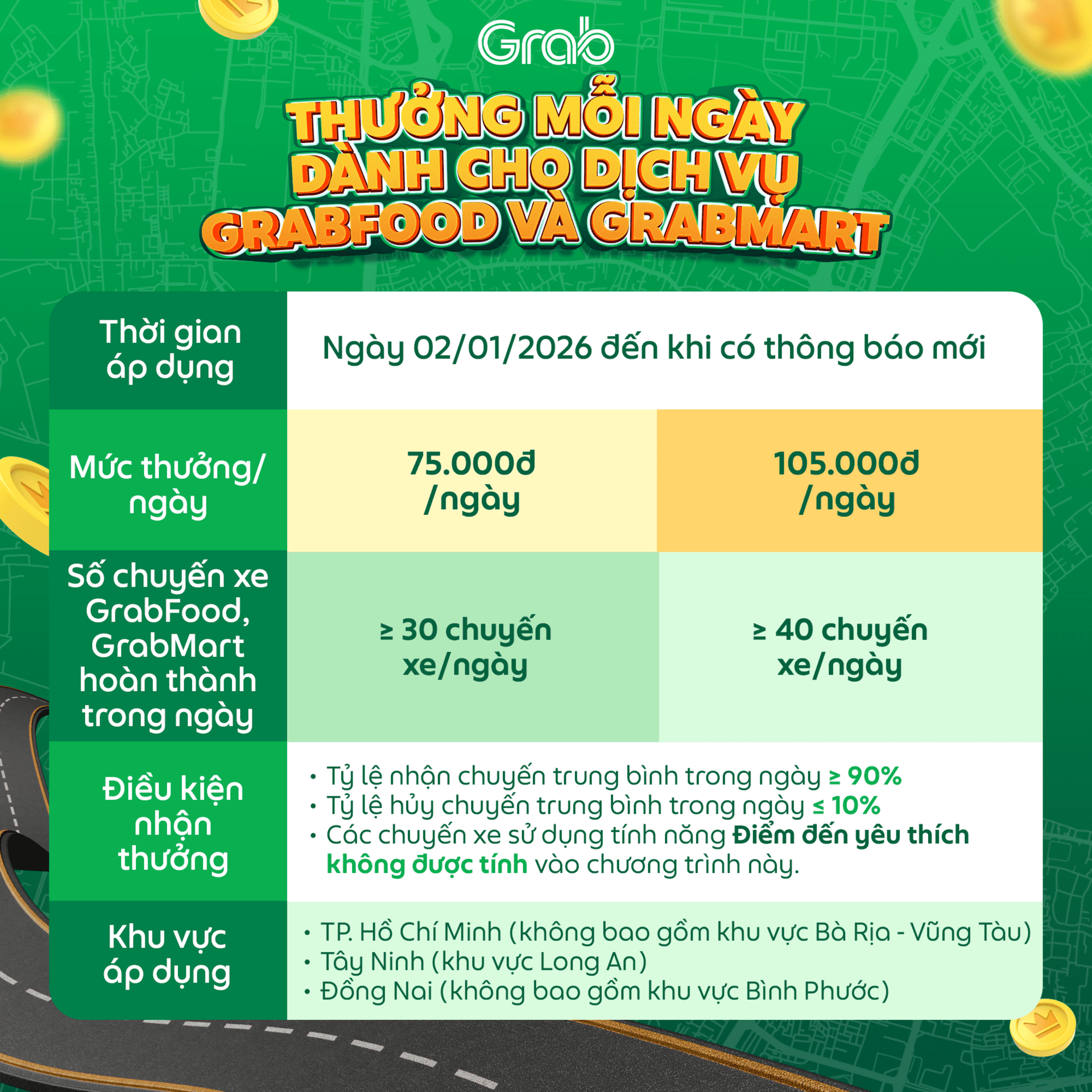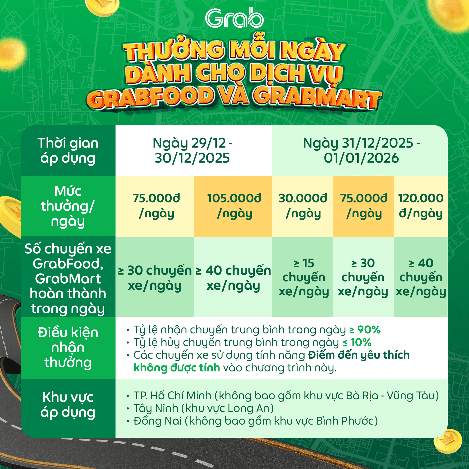 Từ ngày 29/12/2025, Grab cập nhật các chương trình thưởng dành cho toàn bộ Đối tác Grab 2 bánh với chi tiết như sau:
