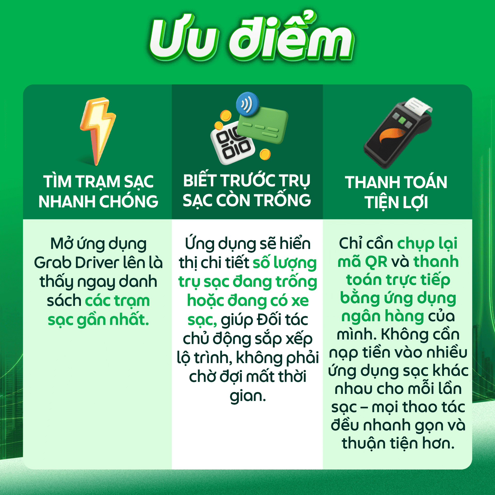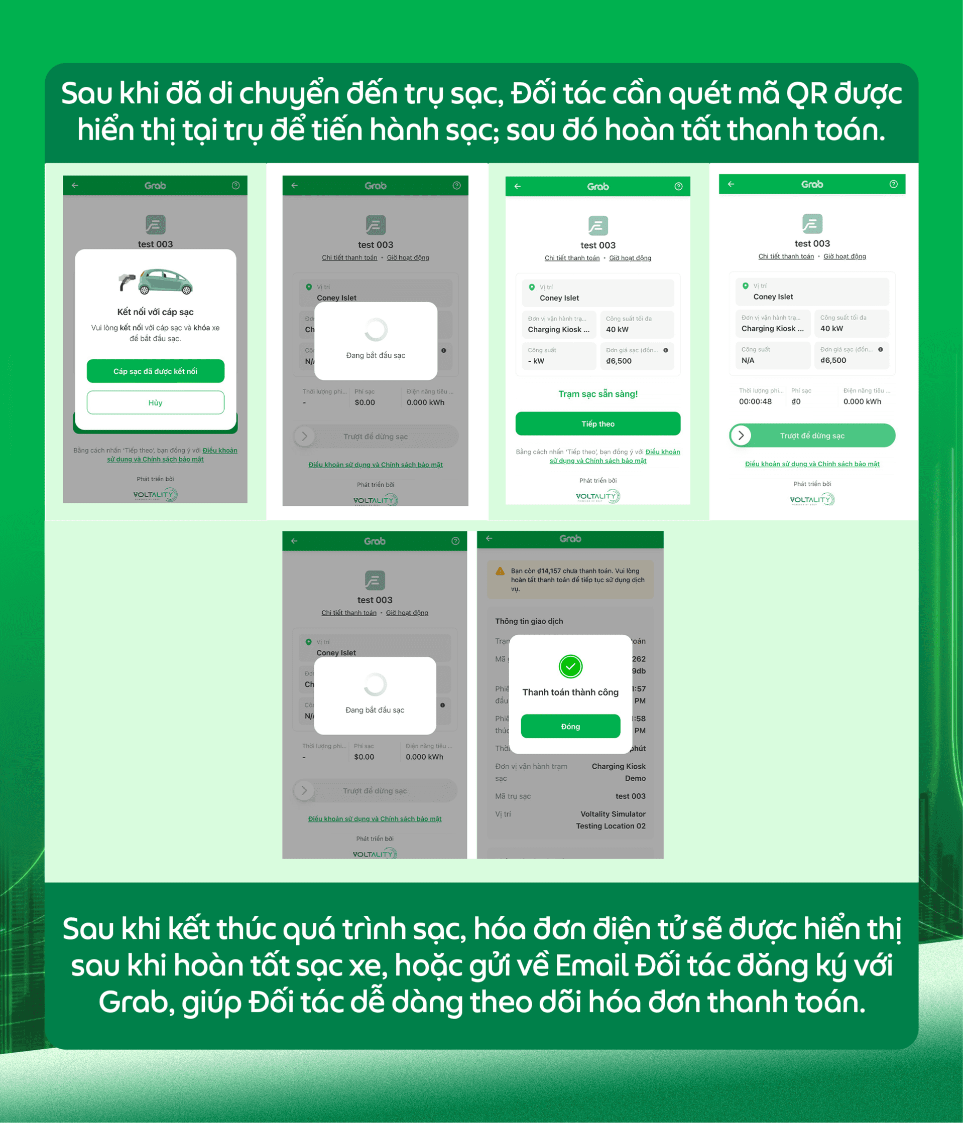 - Để sử dụng tính năng Tiện Ích Sạc Xe, Đối tác cần xác nhận đồng ý với Điều khoản sử dụng và Chính sách bảo mật của tính năng Tiện Ích Sạc Xe, bên cạnh các Điều khoản Dịch vụ hiện có trước khi Đối tác có thể sử dụng tính năng trên. Sau đó, tính năng Tiện Ích Sạc Xe sẽ được tự động kích hoạt trên Ứng dụng Grab Driver của Đối tác.