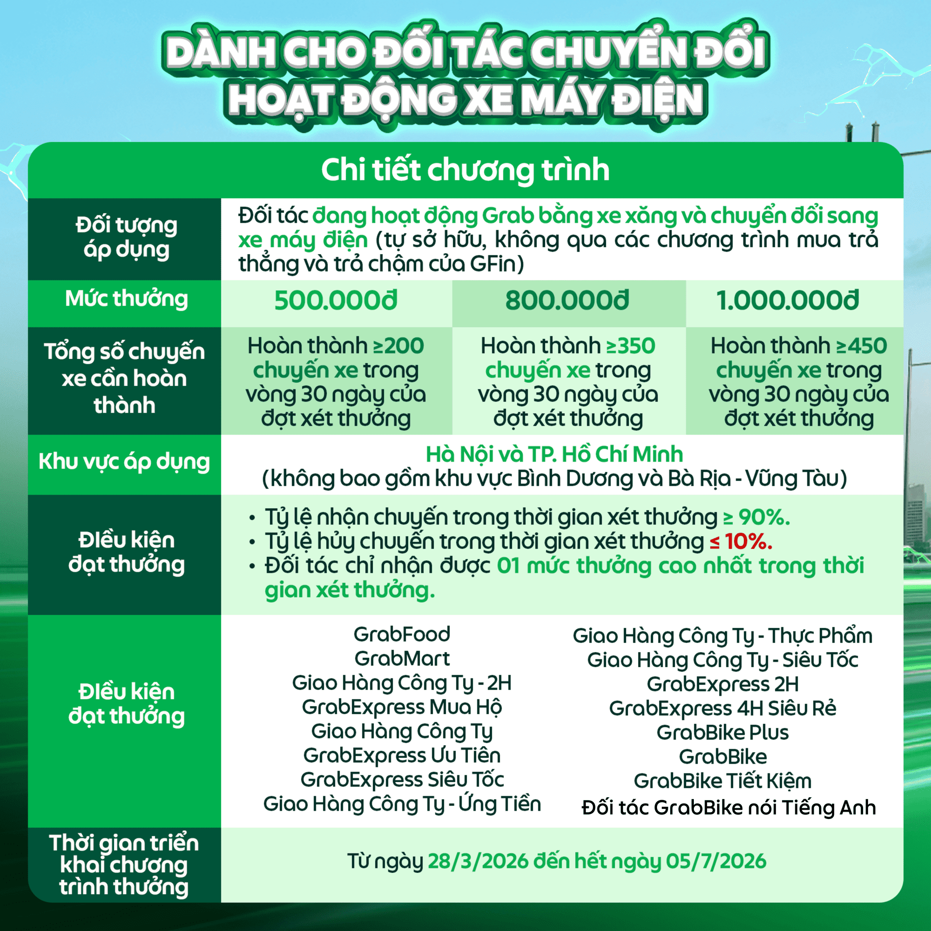 Grab | Tổng hợp chương trình dành cho Đối tác Grab 2 bánh chuyển đổi sang xe máy điện