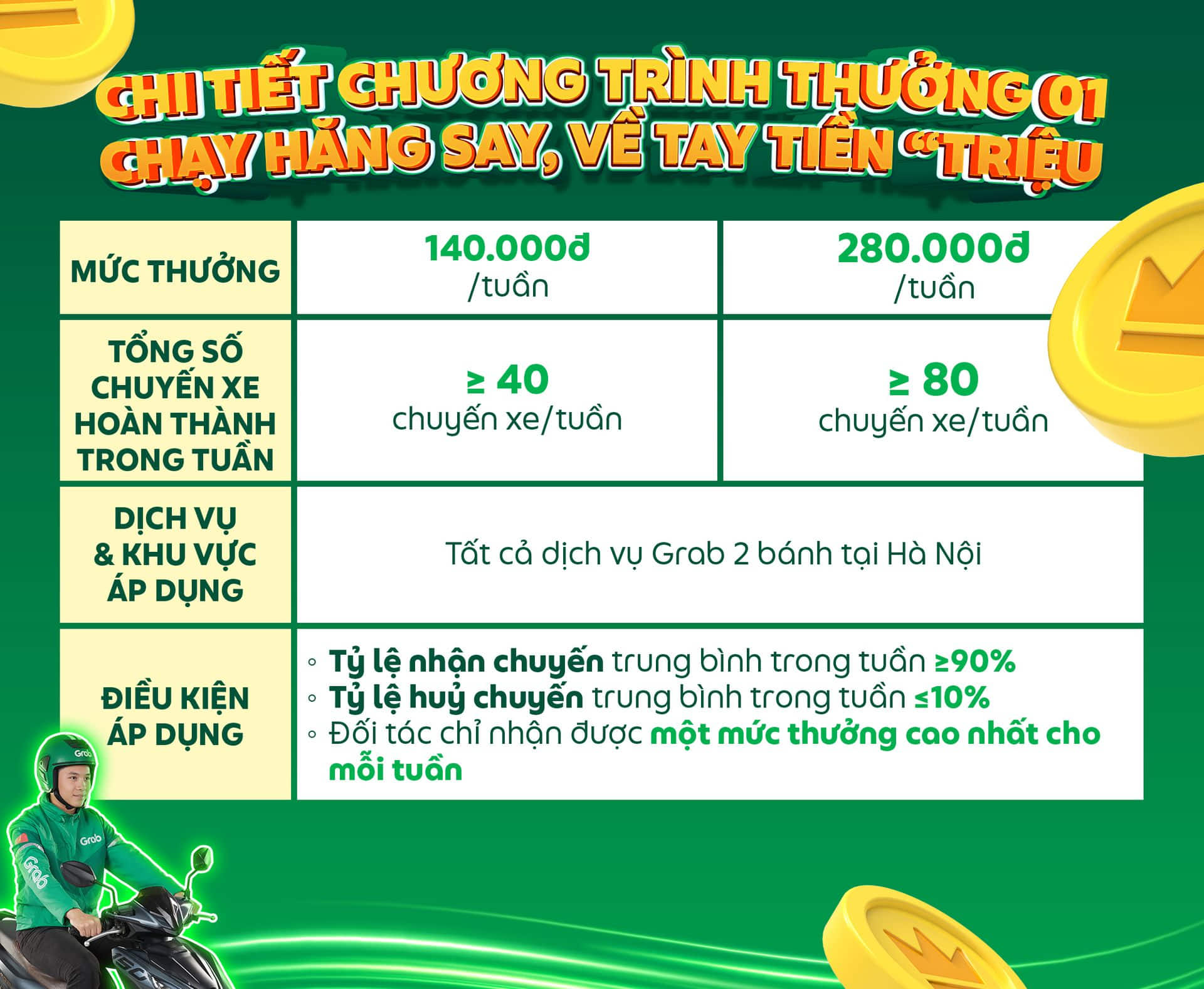 Hơn nữa, chỉ cần hoàn thành 06 chuyến xe/ngày, nhận thưởng 140.000đ/tuần. Về đích 12 chuyến xe/ngày, cơ hội nhận thưởng càng cao 280.000đ/tuần!