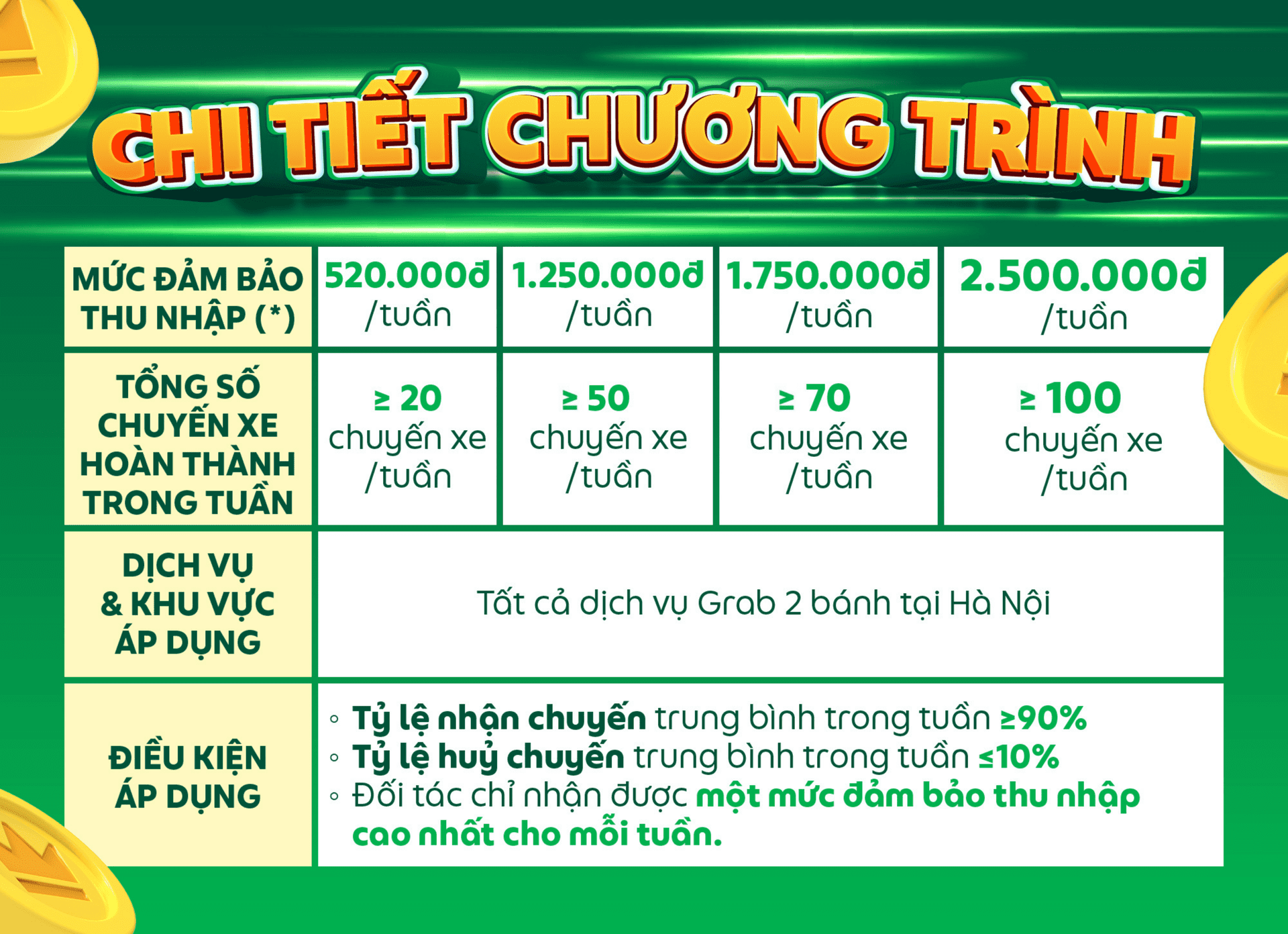 Chỉ cần hoàn thành 08 chuyến xe/ngày, Đối tác đã có thể nhận ngay thu nhập đảm bảo 1.250.000đ/tuần. Về đích 100 chuyến xe/tuần, mức đảm bảo thu nhập lên đến 2.500.000đ/tuần!