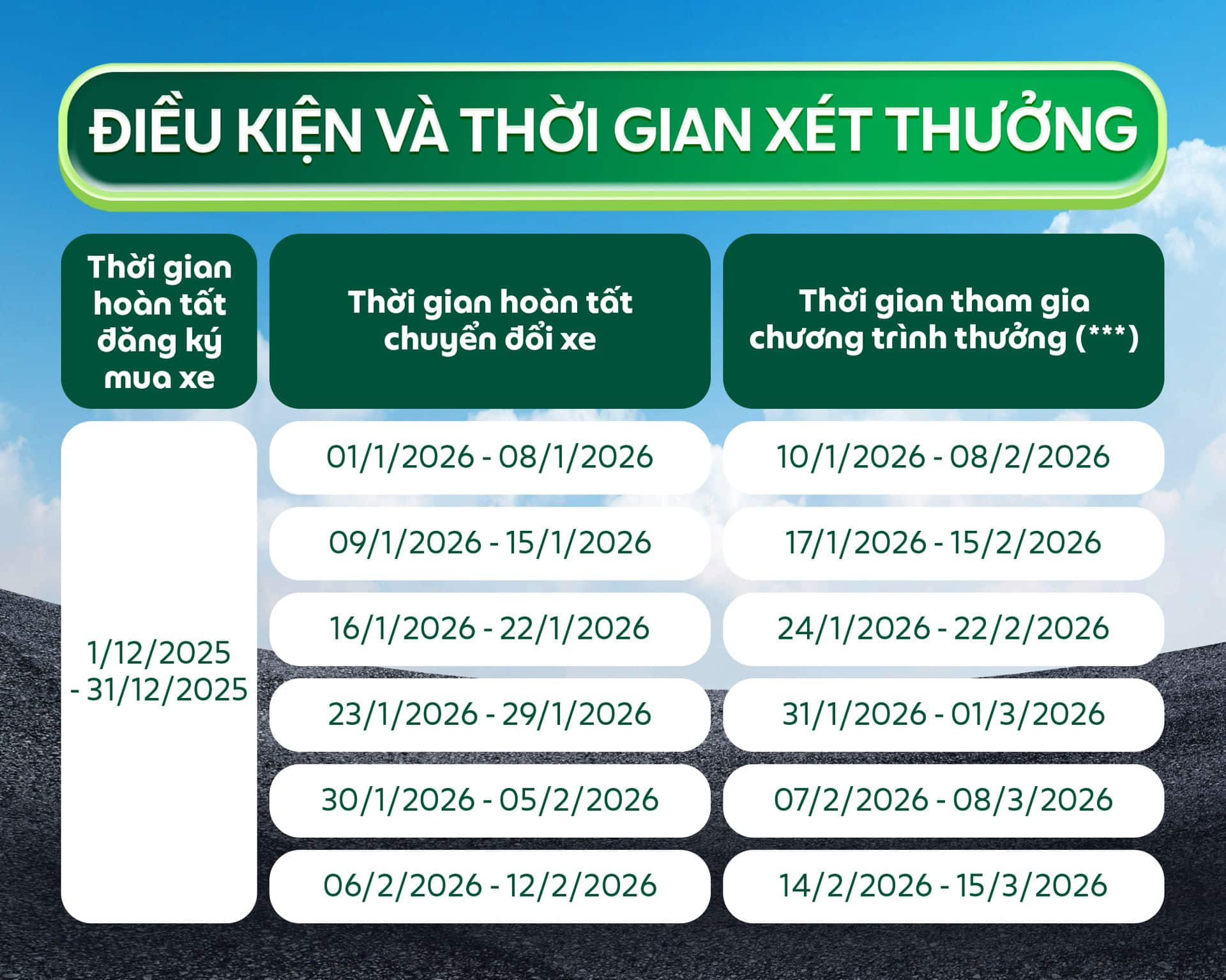 • Hoàn tất đăng ký mua xe trong thời gian từ ngày 01/12 – 31/12/2025. Các trường hợp đăng ký mua xe nằm ngoài giai đoạn này (ví dụ từ ngày 01/1/2026 trở đi) không thuộc đối tượng áp dụng của chương trình thưởng.
