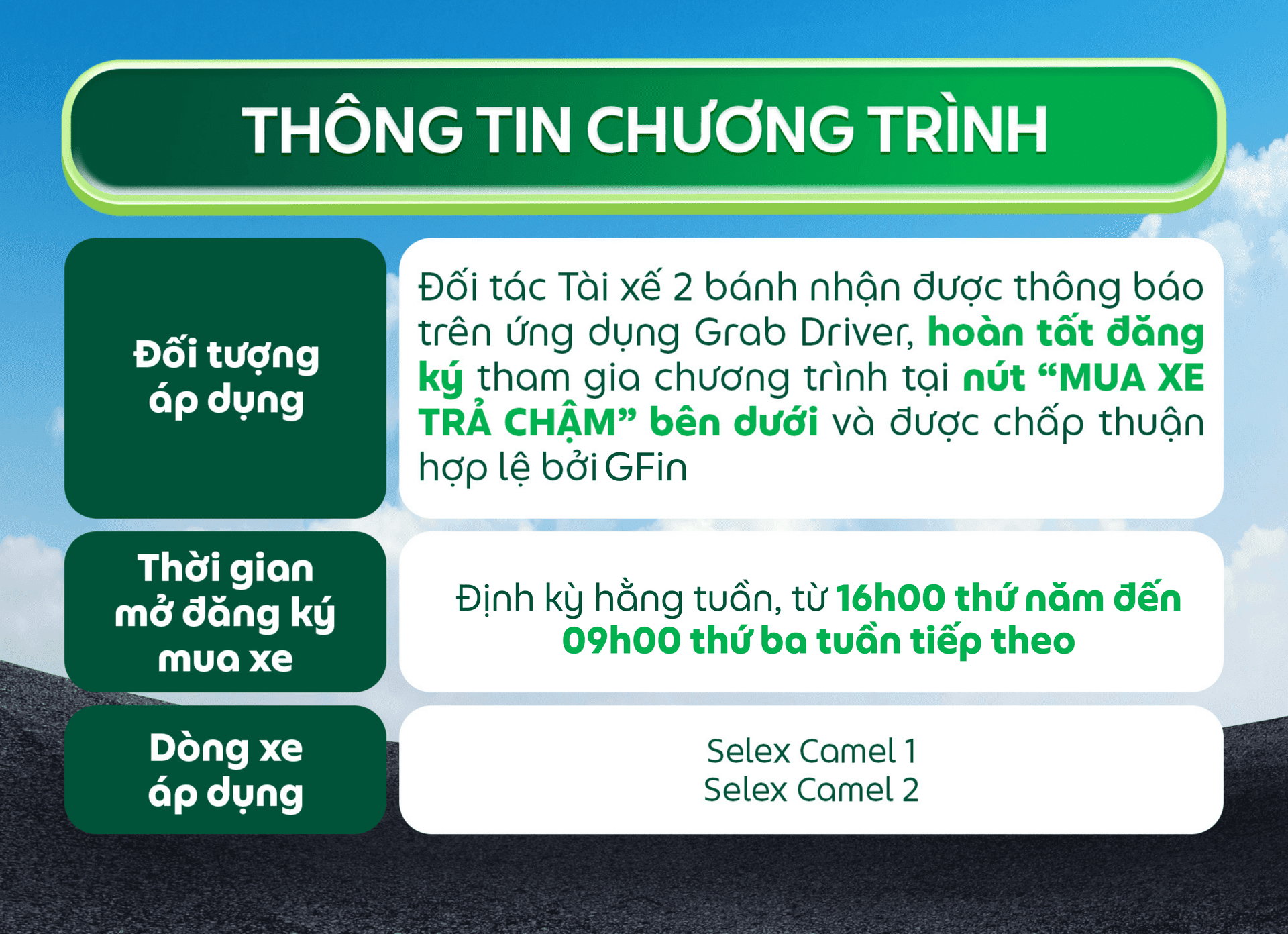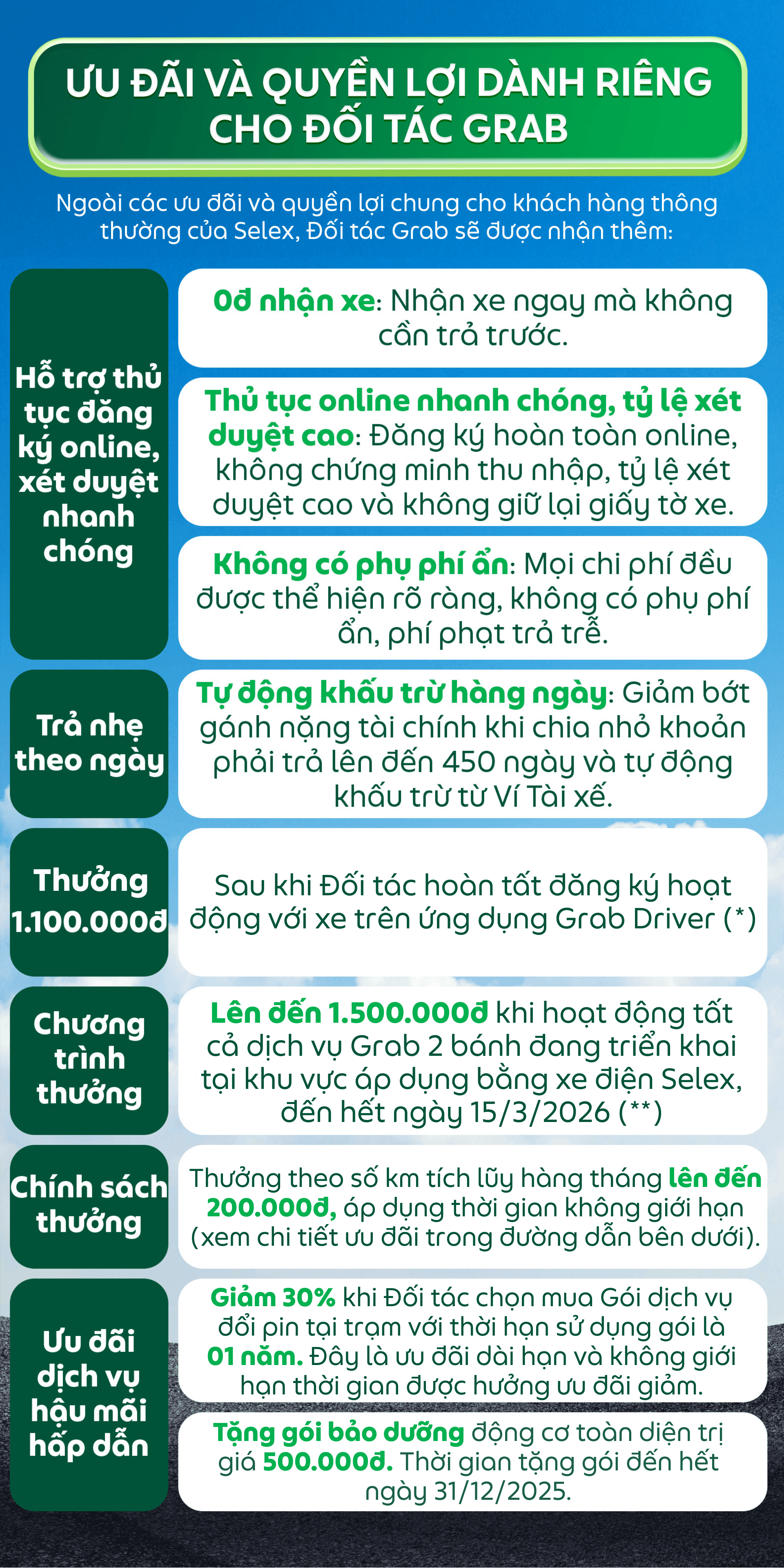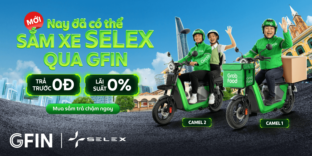 Từ tháng 12/2025, Grab triển khai chương trình hỗ trợ mua sắm trả chậm xe máy điện Selex Camel 1 Camel 2 qua GFin với lãi suất 0%, trả trước 0đ. Đặc biệt, chương trình có những ưu đãi hấp dẫn như thưởng 1.100.000đ và chương trình thưởng lên đến 1.500.000đ khi đăng ký hoạt động bằng phương tiện này trên nền tảng Grab, cũng như tận hưởng ưu đãi gói đổi pin và các quyền lợi khác!