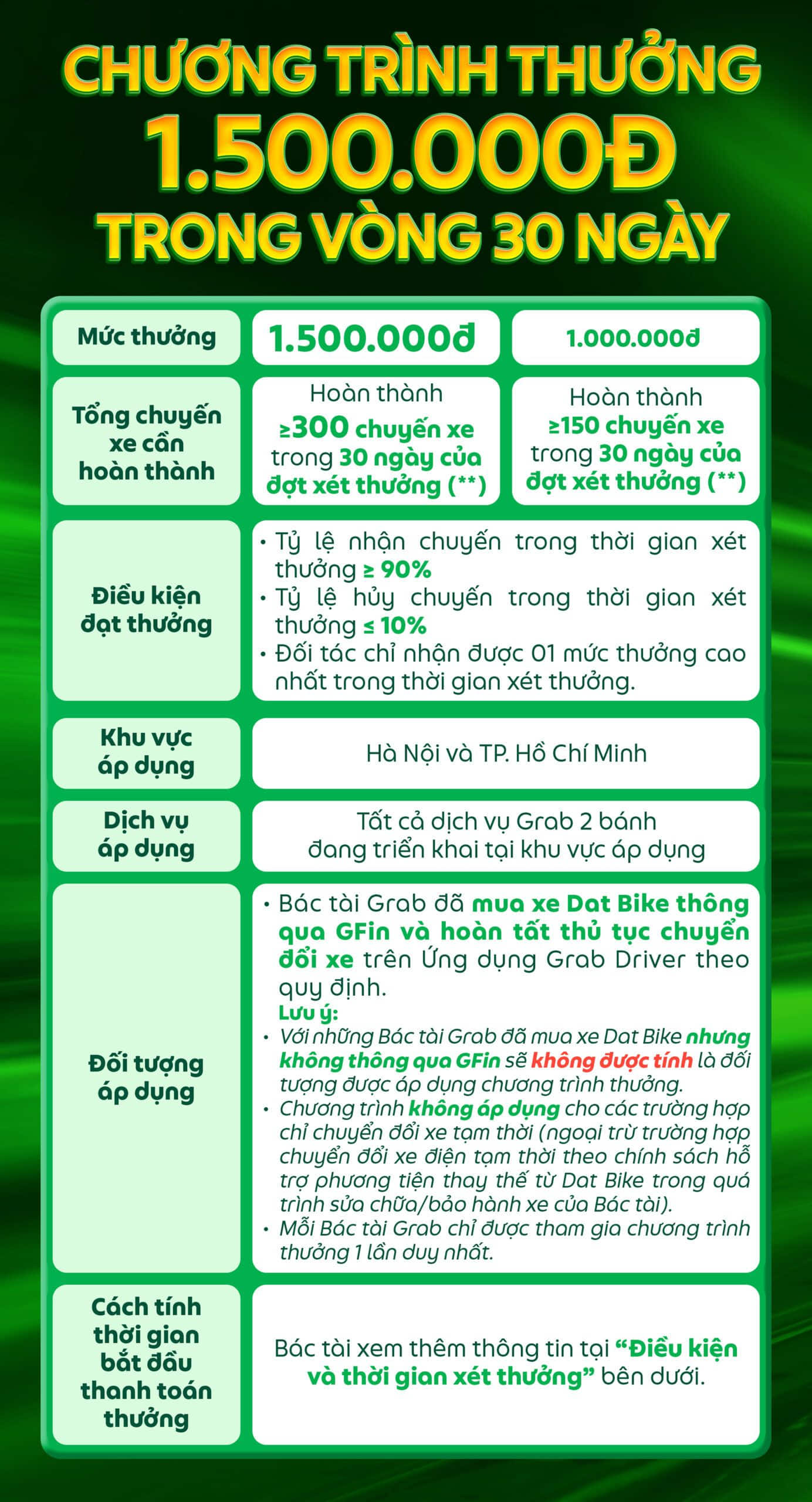 Từ cuối tháng 10/2025, Grab nâng cấp chương trình hỗ trợ dành cho Bác tài mua xe máy điện Dat Bike theo hình thức trả thẳng (thanh toán toàn bộ trong một lần), với mức thưởng cao hơn lên đến 1.500.000đ!