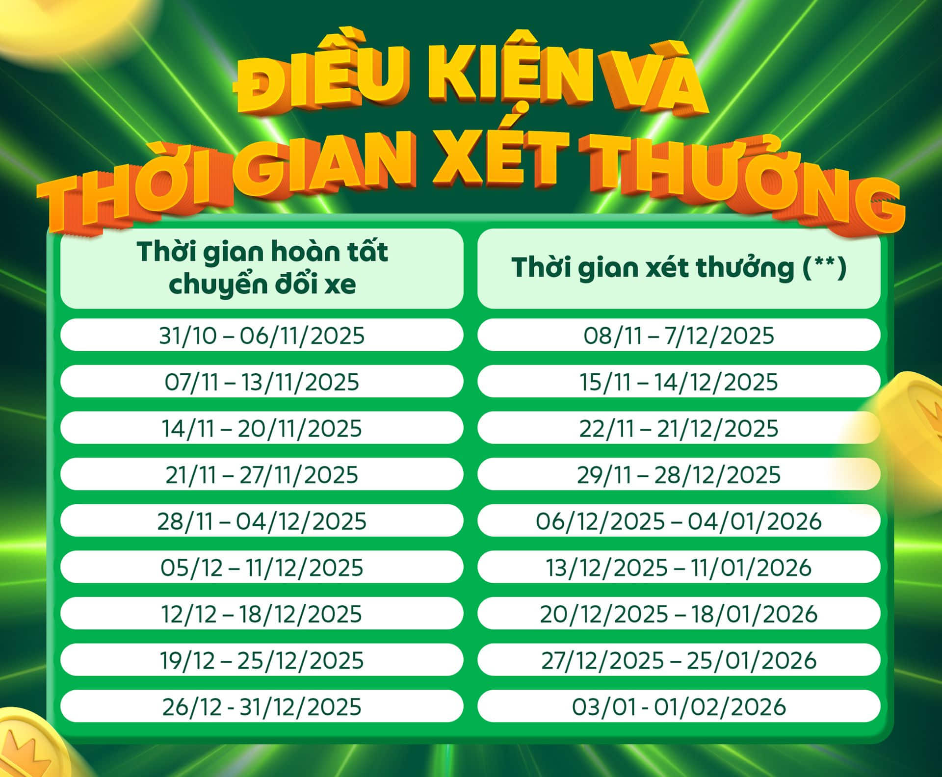 Chương trình thưởng sẽ kết thúc khi đủ 2000 Đối tác đủ điều kiện nhận thưởng hoặc khi hết chu kỳ Bác tài mua và chuyển đổi xe được áp dụng (đến hết ngày 31/12/2025), tùy theo điều kiện nào tới trước.