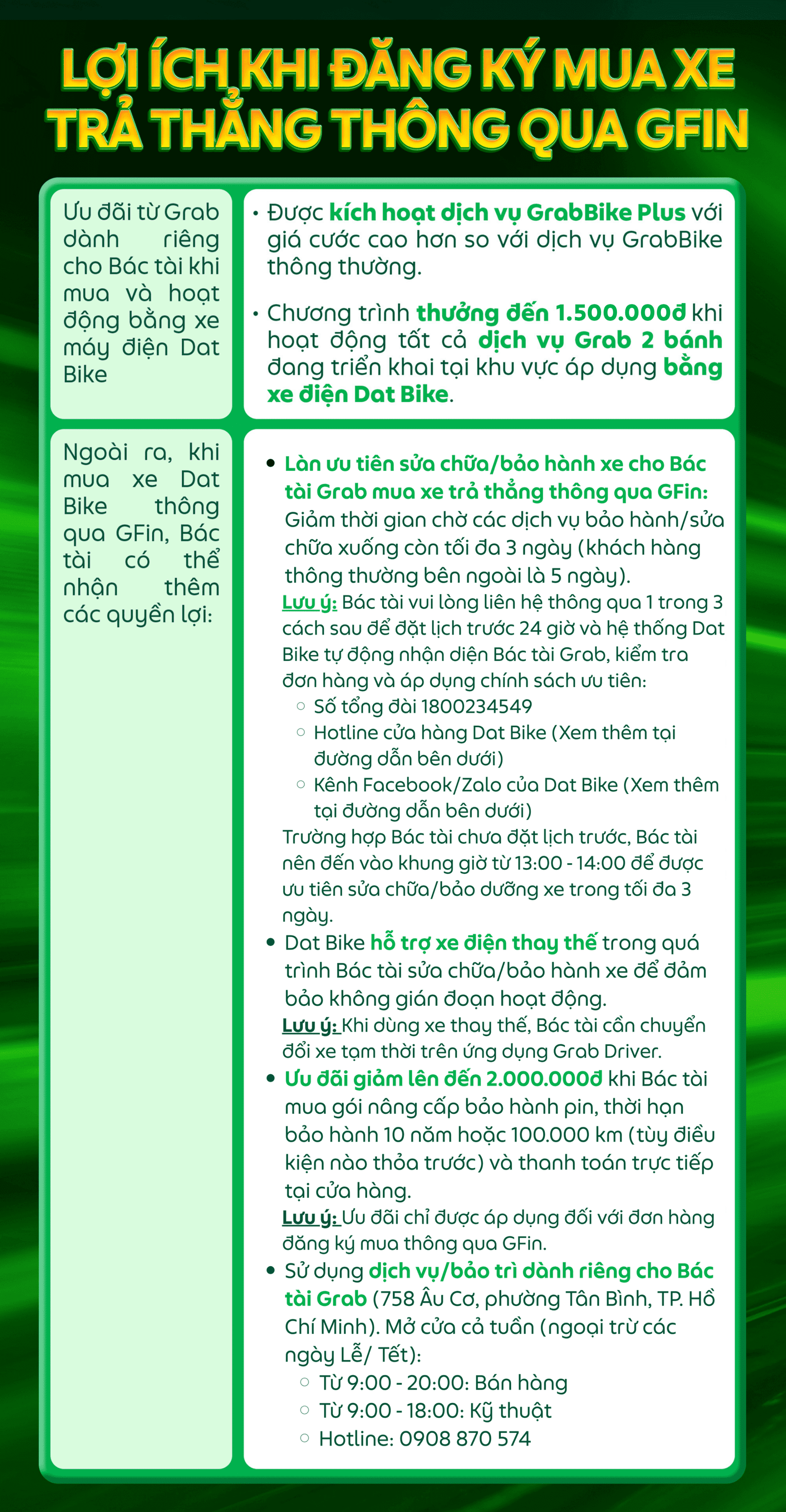 Hãy cùng khám phá những 🌟 chính sách hậu mãi và quyền lợi độc quyền dành cho Bác tài Grab, cách thức “rinh về” dòng xe điện Dat Bike và chương trình thưởng lên đến 1.500.000đ ngay hôm nay!
