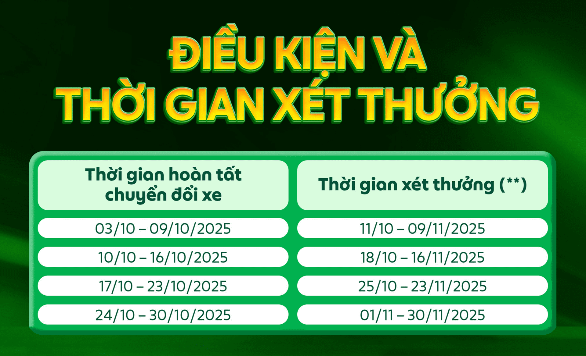 Số chuyến xe mà Đối tác hoàn thành phải nằm trong thời gian xét thưởng và tài khoản Grab Driver của Đối tác phải được kích hoạt trong mốc thời gian tương ứng như quy định tại bảng “ĐIỀU KIỆN VÀ THỜI GIAN XÉT THƯỞNG” trên.