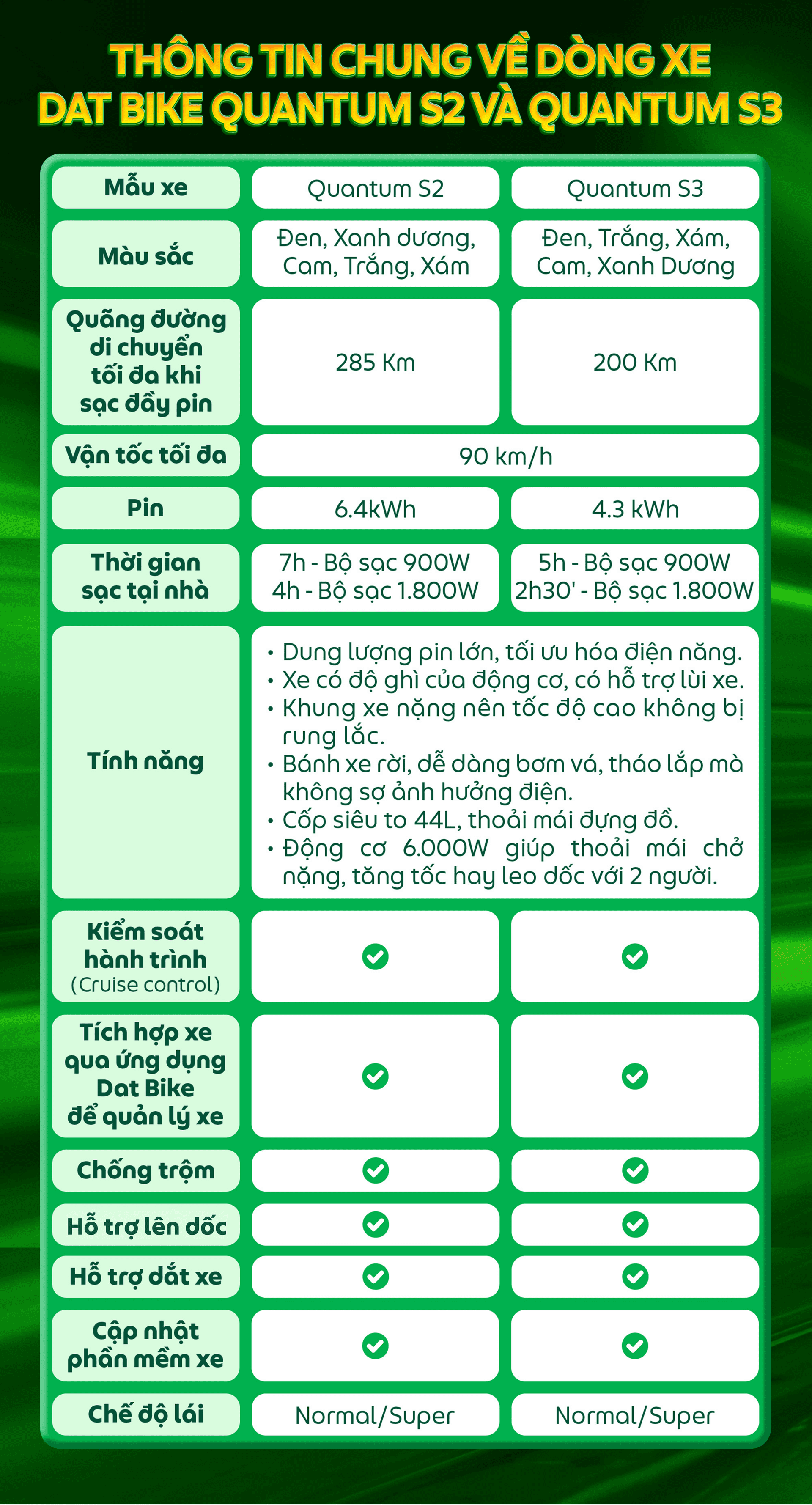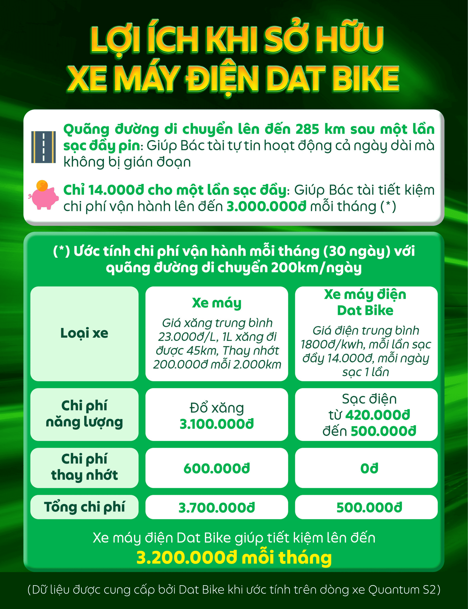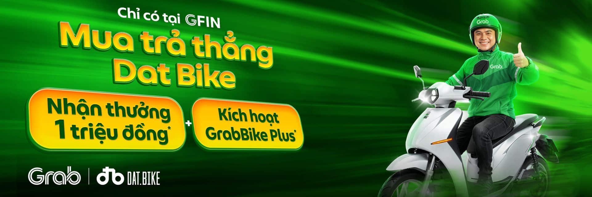 Từ tháng 10/2025, GFin kết hợp cùng Dat Bike mang đến cơ hội đặc biệt để Bác tài có thể sở hữu xe máy điện Dat Bike Quantum S2 và Quantum S3 với hình thức trả thẳng (thanh toán toàn bộ trong một lần). Đây không chỉ là phương tiện hiện đại, tiết kiệm chi phí vận hành, mà còn là “cần câu cơm” bền bỉ trên hành trình hoạt động Grab 2 bánh – từ chở Hành khách đến giao hàng.
