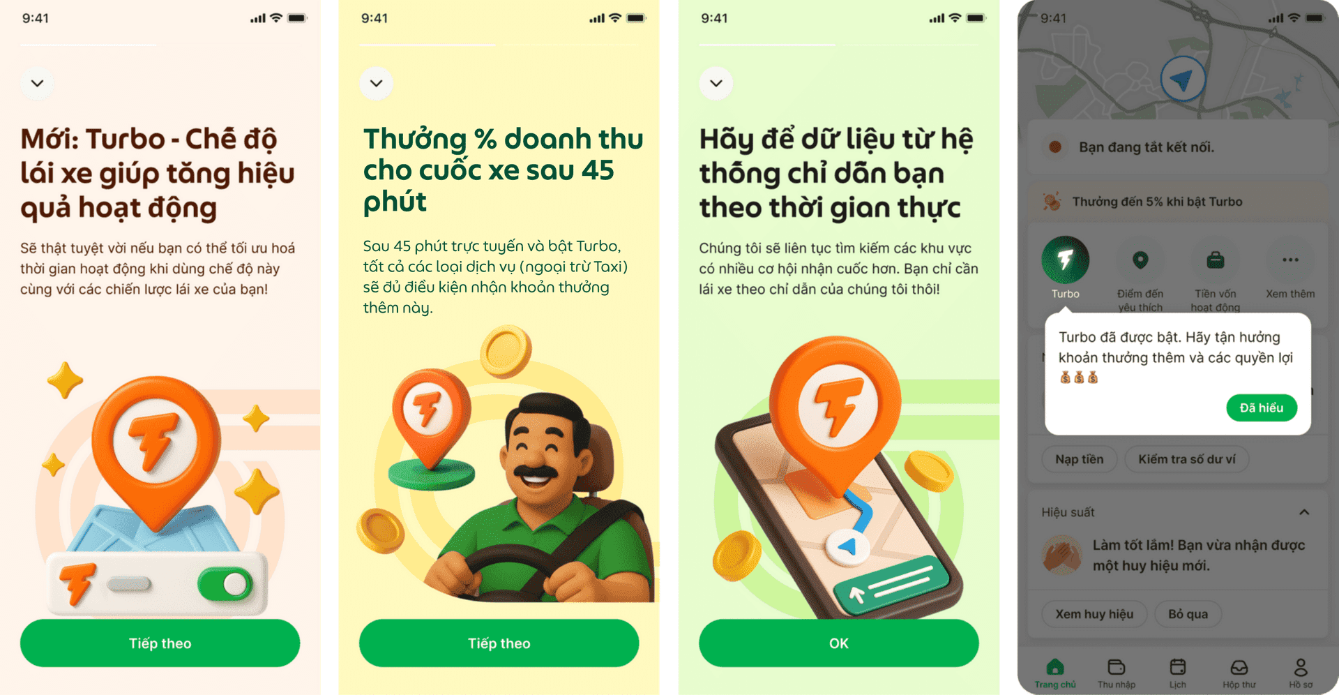 Hệ thống yêu cầu thời gian trực tuyến để Đối tác mở khóa các quyền lợi như: chọn nhiều Khu vực yêu thích để tăng cơ hội nhận chuyến xe, truy cập sớm vào chương trình Khung giờ hiệu quả…v.v. Đối tác có thể kiểm tra mục Turbo trên ứng dụng để biết số giờ trực tuyến cần thiết để mở khóa từng quyền lợi. Đối tác có thể theo dõi tổng thời gian bật Turbo trong ngày khi nhấn vào biểu tượng