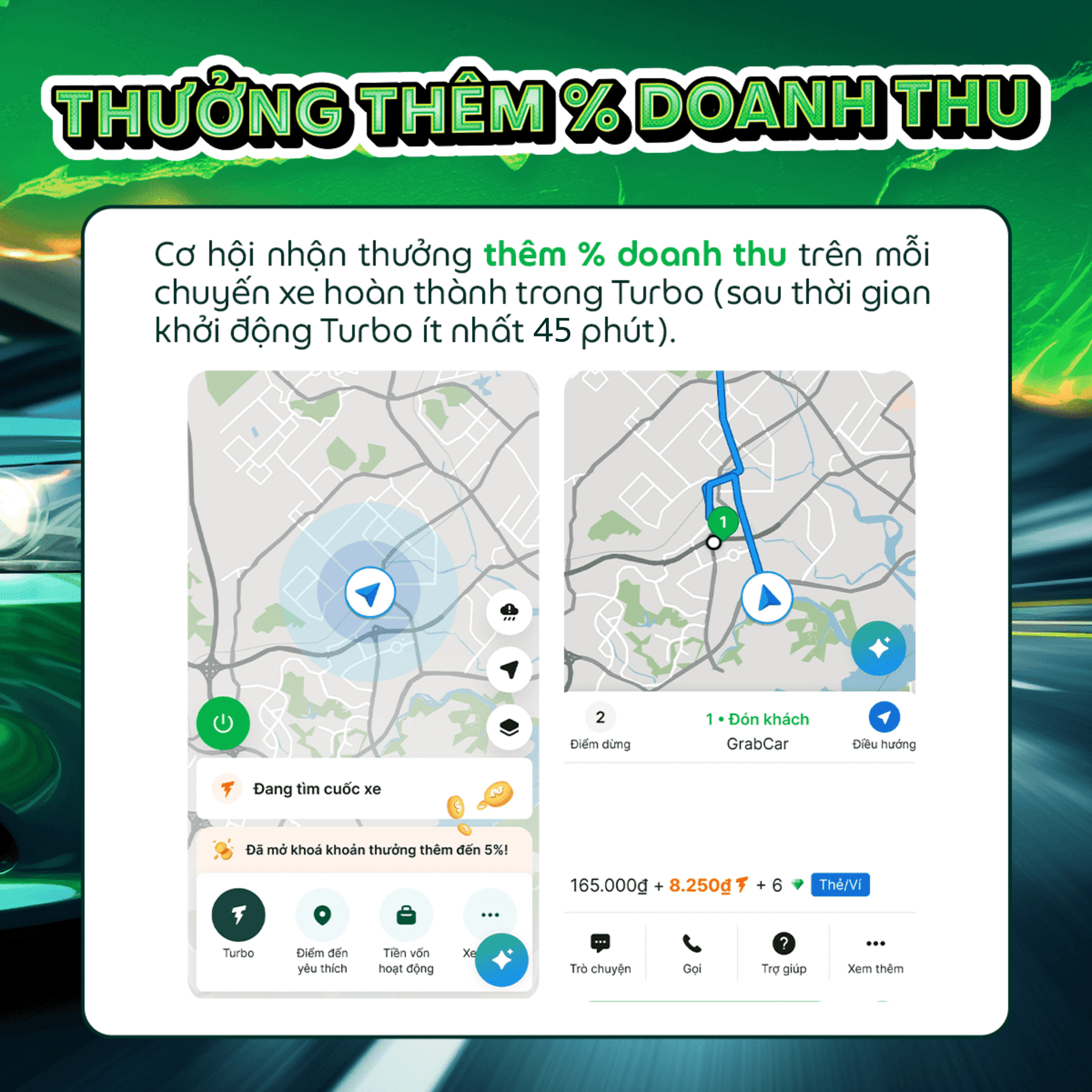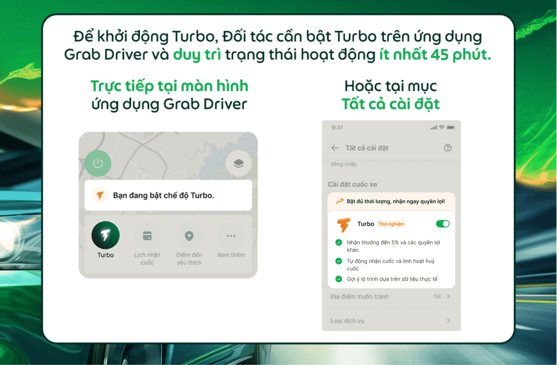 Đừng bỏ lỡ cơ hội trải nghiệm và tận dụng tất cả những gì Turbo mang lại. Bật tính năng Turbo và đồng hành cùng Grab để tăng tốc trên hành trình của Đối tác!