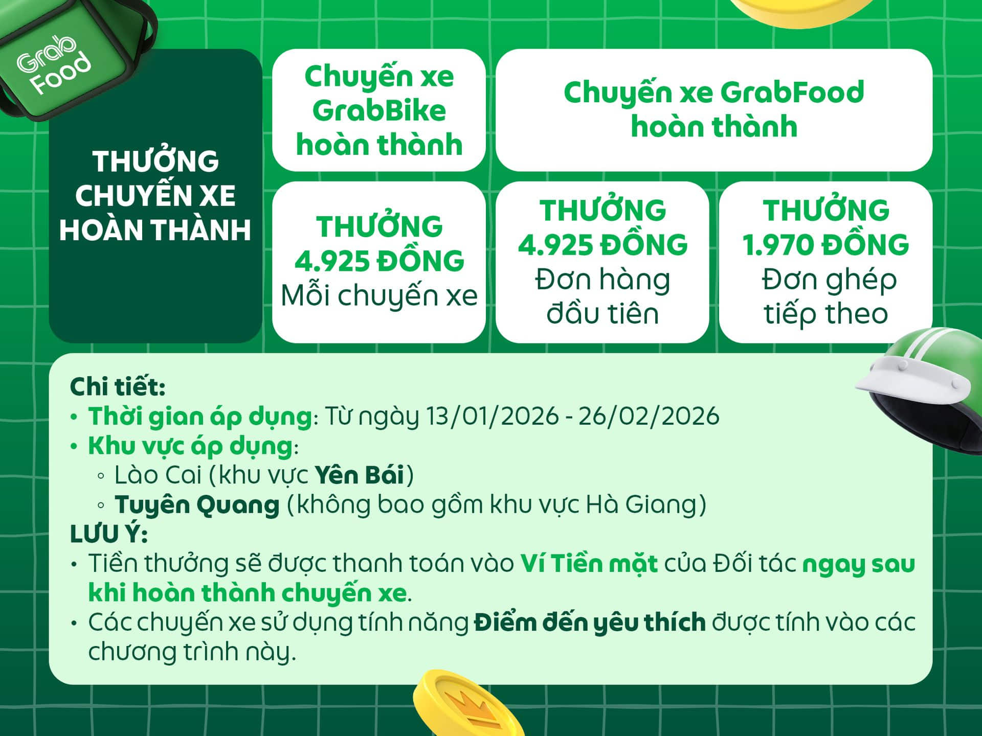 Grab mang đến cơ hội thưởng hấp dẫn cho Đối tác khi hoàn thành chuyến xe Grab 2 bánh với chi tiết như sau: