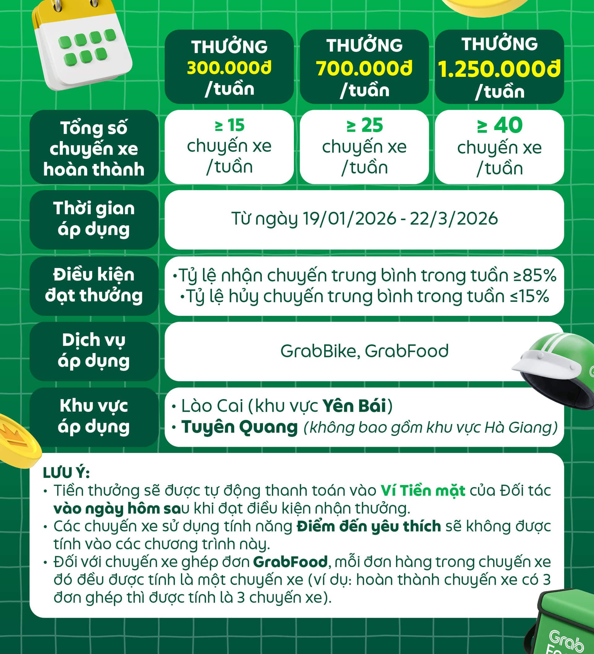 Các điều kiện của chương trình có thể thay đổi và sẽ được thông báo đến Đối tác, Grab có toàn quyền quyết định điều kiện và mức thưởng cuối cùng.