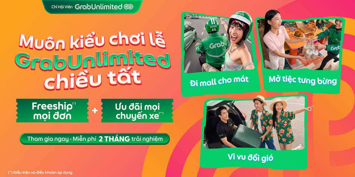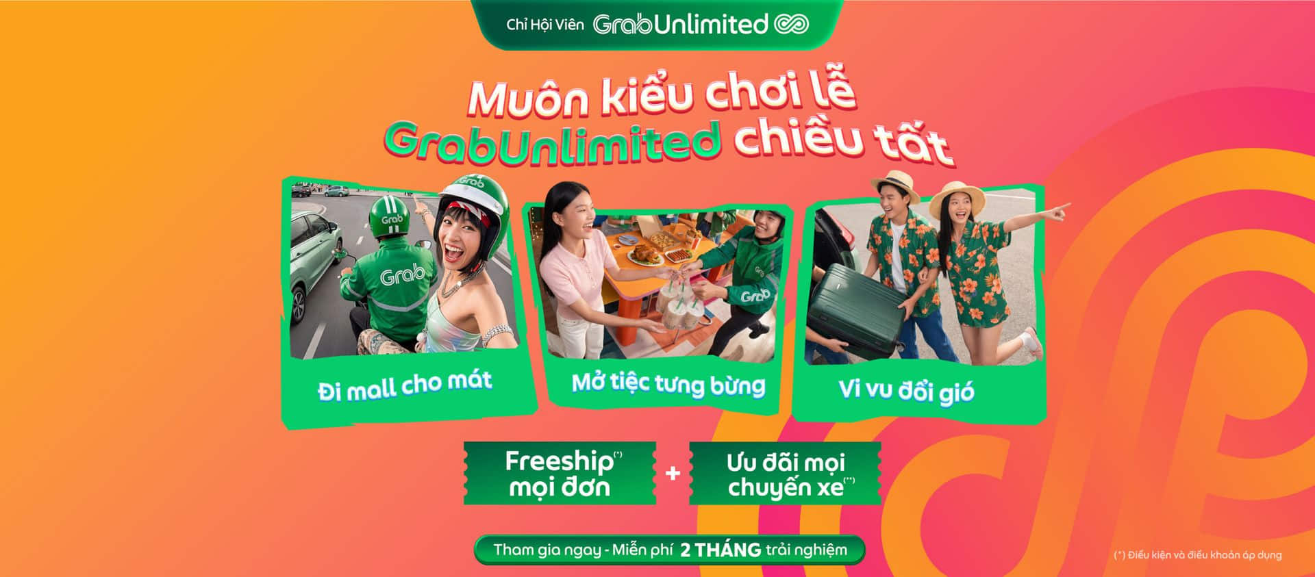Lễ này, đi mall cho mát, hay mở tiệc tại gia, hay vi vu xả láng, ví vẫn nhẹ nhàng. GU chơi lễ kiểu gì, GrabUnlimited cũng chiều tất! 👉 👉 👉 Tham gia ngay, hưởng thêm 2 tháng dùng thử miễn phí(*) ngay!