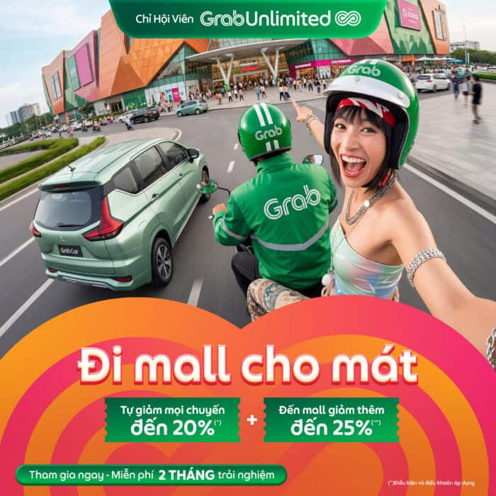 Giảm sẵn 20% khi đặt GrabCar Plus hoặc giảm 5% cho các dòng GrabCar còn lại + giảm thêm đến 25%(*) khi đặt xe đến các Mall.