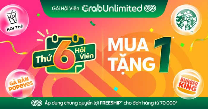 Các ưu đãi đặc biệt sẽ được cập nhật mỗi Thứ 6 trên GrabFood và dành riêng cho hội viên GrabUnlimited. Bạn hãy tranh thủ Tham gia gói hội viên để tận hưởng món ngon, deal hời mỗi tuần nha.