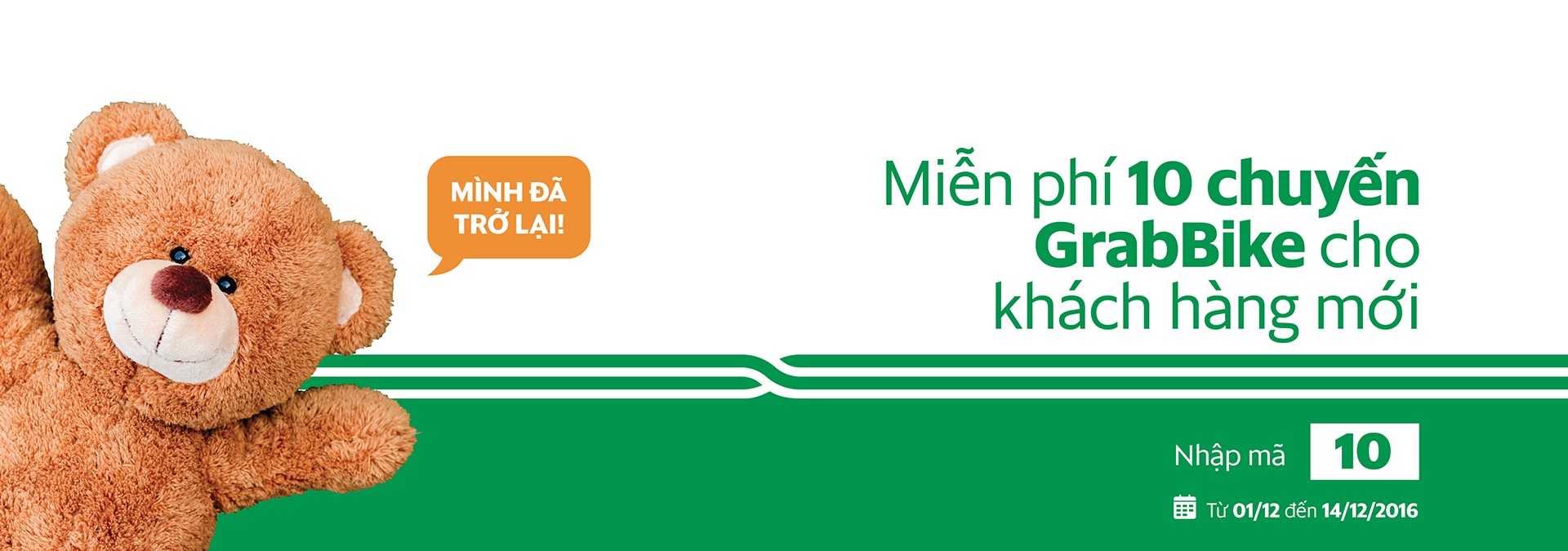“Bé Gấu” GrabBike hôm nay đã chính thức trở lại trên khắp nẻo đường Hà Nội và Tp.HCM rồi nè 500 anh em ơi! Ở lần xuất hiện này, “bé Gấu” chắc chắn sẽ khiến bạn ngạc nhiên không ngừng vì sự nhiệm màu của mình: Tặng 10 chuyến GrabBike miễn phí (tối đa 30.000đ/chuyến) cho các khách hàng lần đầu sử dụng dịch vụ GrabBike, khi đặt xe và nhập mã khuyến mãi:
