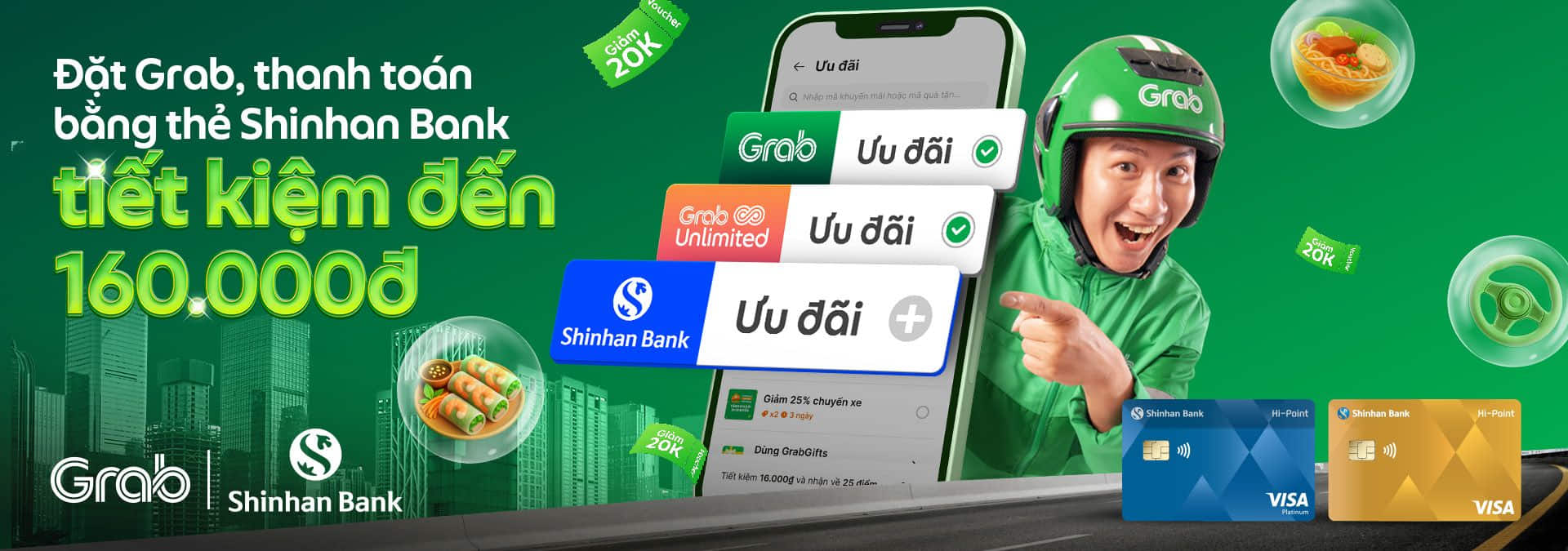 Nhập mã SHINHANTPT khi đặt chuyến xe GrabBike/GrabCar, giảm 20.000Đ cho chuyến xe từ 80.000Đ.