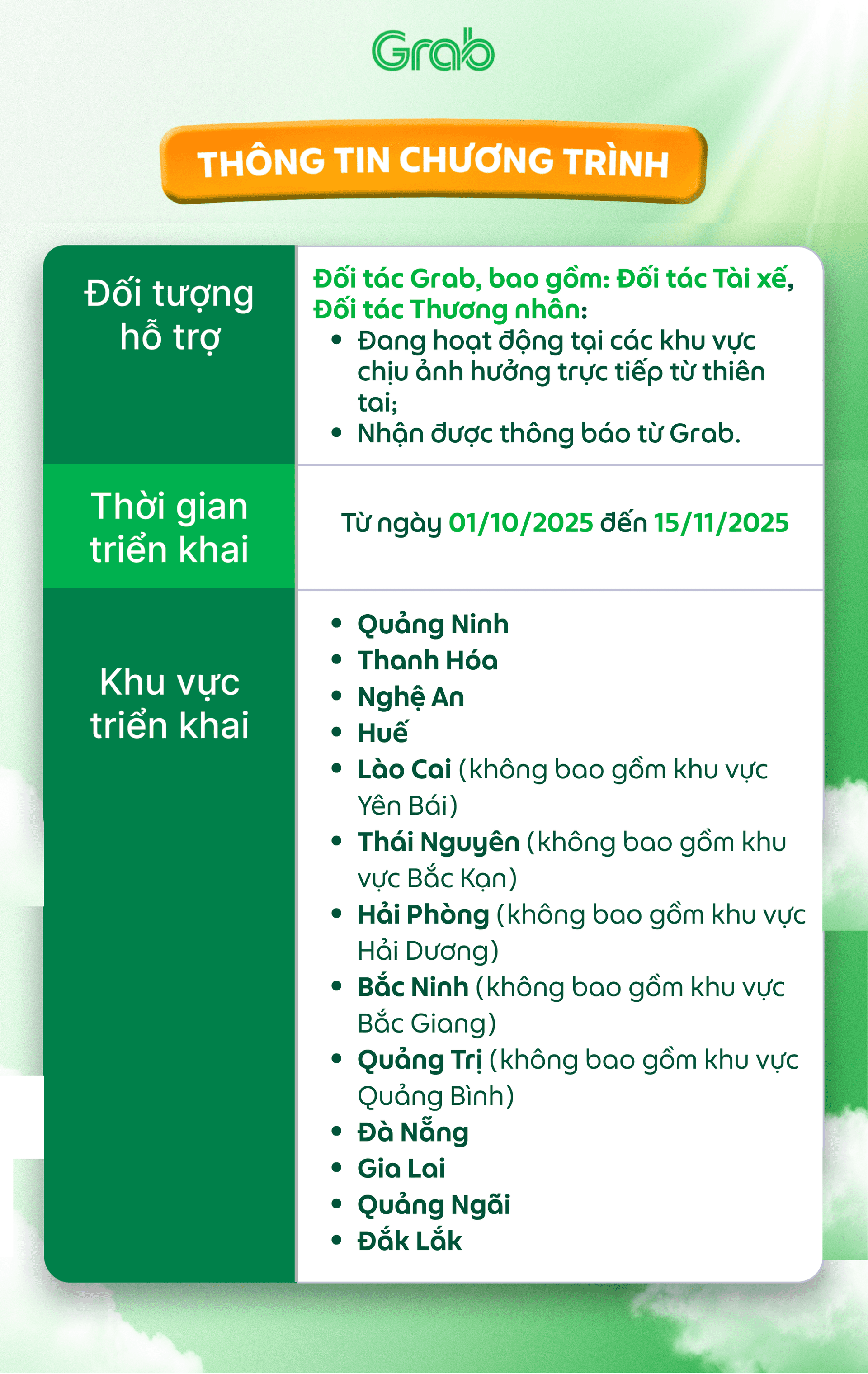 Để chia sẻ phần nào những khó khăn và thiệt hại do diễn biến thời tiết phức tạp gây ra ở các tỉnh, thành trực tiếp chịu ảnh hưởng, Grab triển khai chương trình hỗ trợ “Chung tay vượt khó” (“chương trình”). Grab hy vọng chương trình này có thể động viên Đối tác sớm ổn định cuộc sống và tiếp tục an tâm đồng hành cùng Grab.
