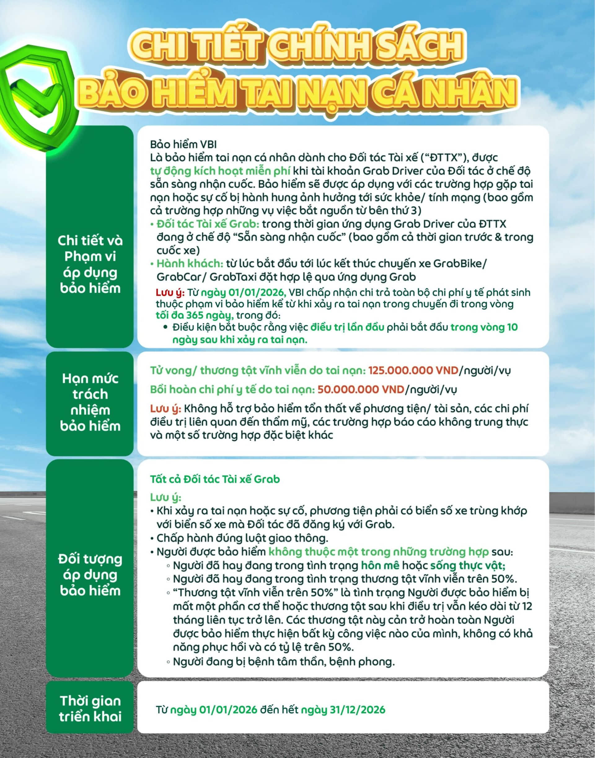 Nhằm đảm bảo an toàn cho Đối tác Tài xế và Hành khách, Grab xin thông báo áp dụng chính sách bảo hiểm tai nạn cá nhân dành cho tất cả Đối tác Tài xế Grab trên toàn quốc trong năm 2026. Cụ thể: