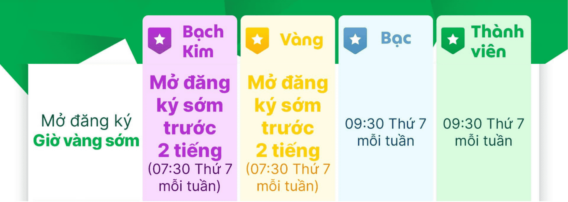 Quyền lợi “Đăng ký sớm chương trình Giờ vàng” khi là Đối tác Tài xế có thành tích hoạt động đạt hạng Vàng và Bạch Kim trong tháng.