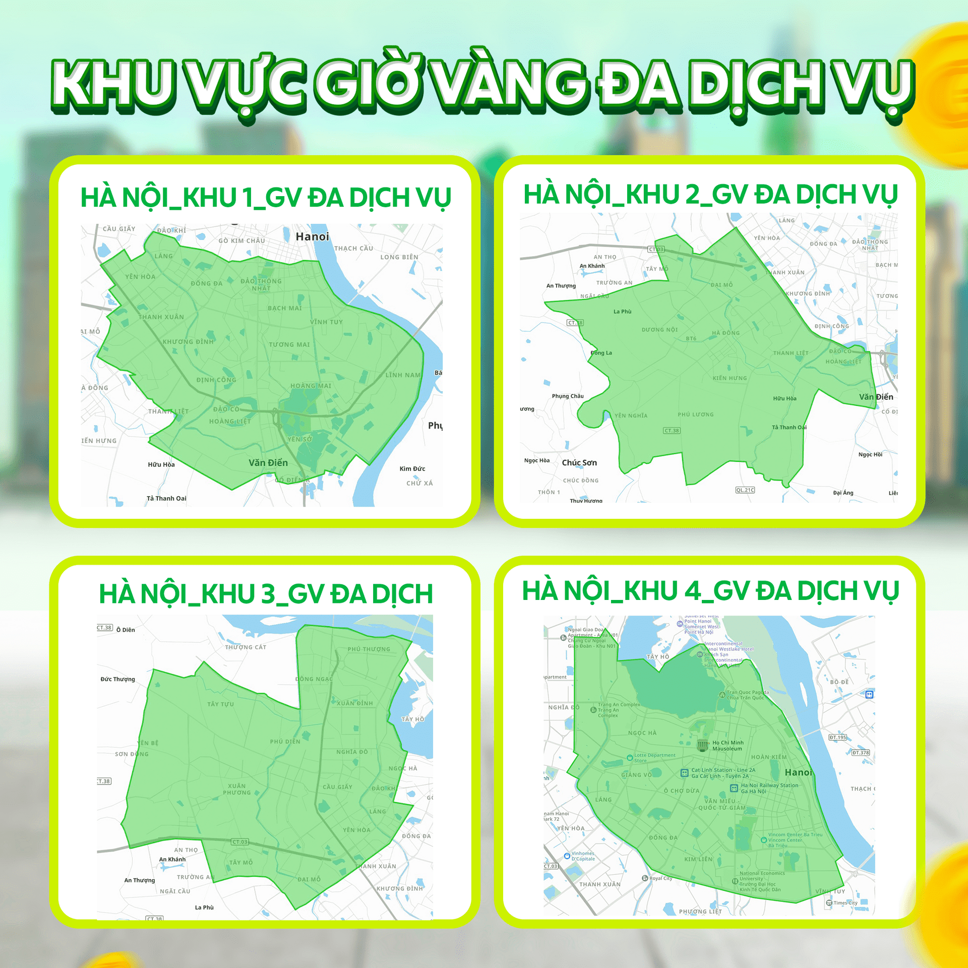 - Miêu tả khu vực chỉ mang tính chất tham khảo nhằm giúp Đối tác hiểu khái quát về vị trí địa lý của từng khu vực hoạt động, không phải ranh giới địa lý hành chính. Đối tác vui lòng xem kỹ hình ảnh bản đồ của từng khu vực khi thực hiện đăng ký khung giờ & khu vực hoạt động trên ứng dụng Grab Driver.