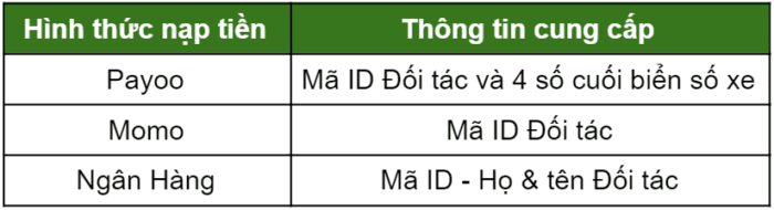 - Để nhanh chóng nhận tiền vào tài khoản Grab, Đối tác phải cung cấp đúng thông tin khi nạp tiền qua 3 kênh theo hướng dẫn sau: