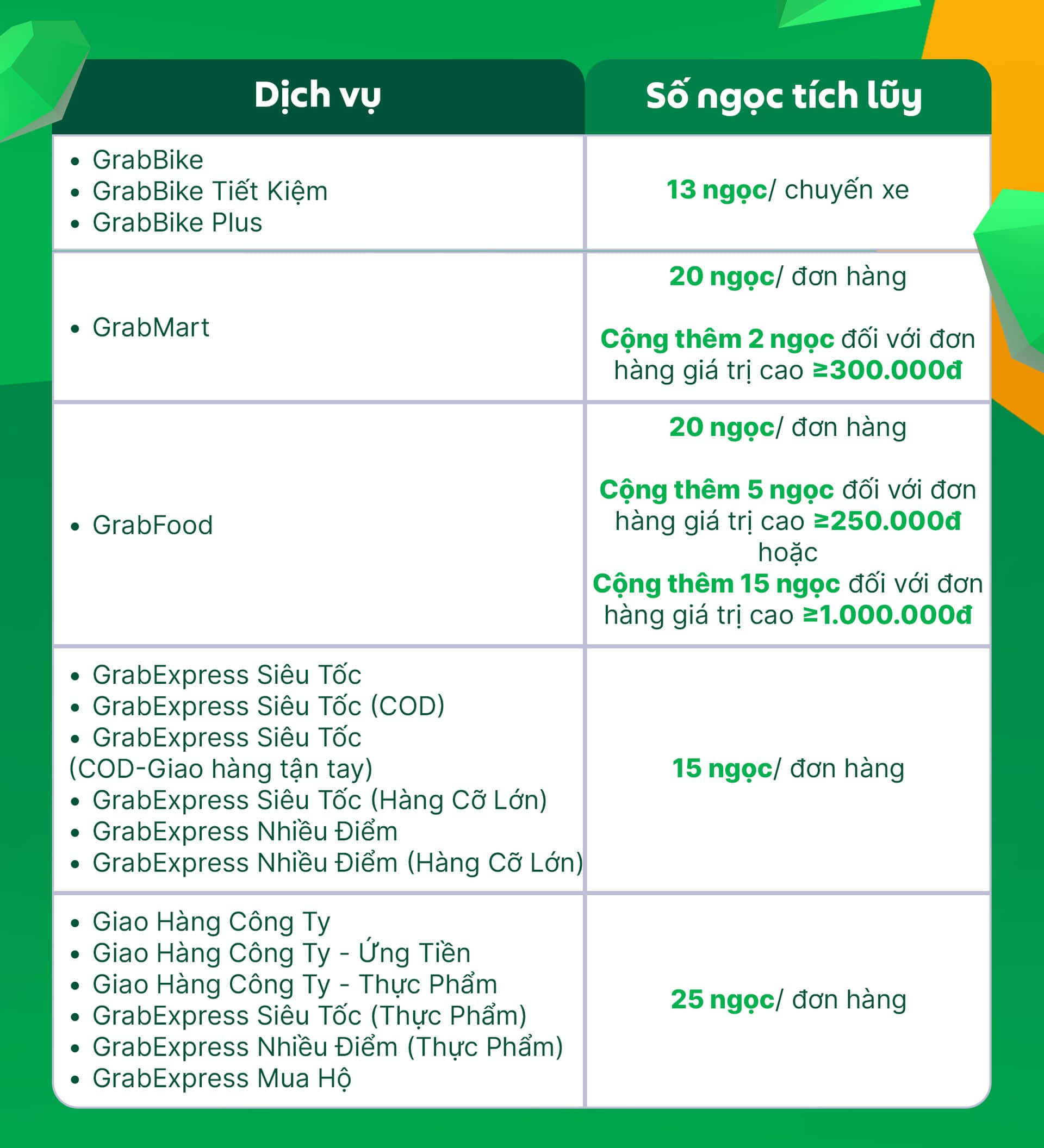 Mỗi chuyến xe hoàn thành sẽ được quy đổi thành số ngọc thưởng tương ứng trên ứng dụng Grab Driver dựa vào bảng bên dưới: