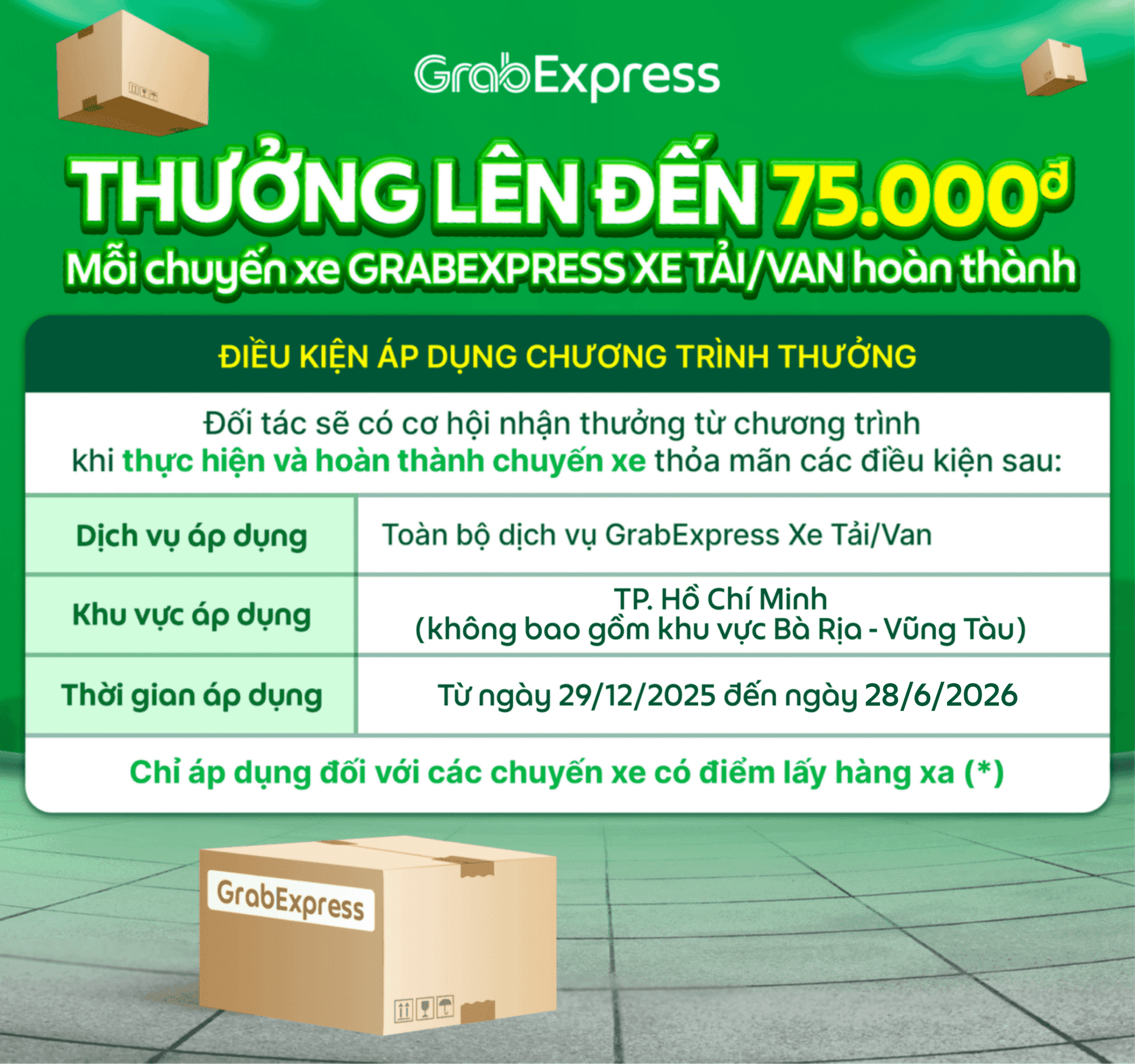 Như một sự khích lệ dành riêng cho Đối tác tài xế Grab khi thực hiện và hoàn thành các chuyến xe từ dịch vụ GrabExpress Xe Tải/Van, Grab tiếp tục triển khai chương trình thưởng lên đến 75.000đ cho mỗi chuyến xe hoàn thành. Thông tin chi tiết như sau: