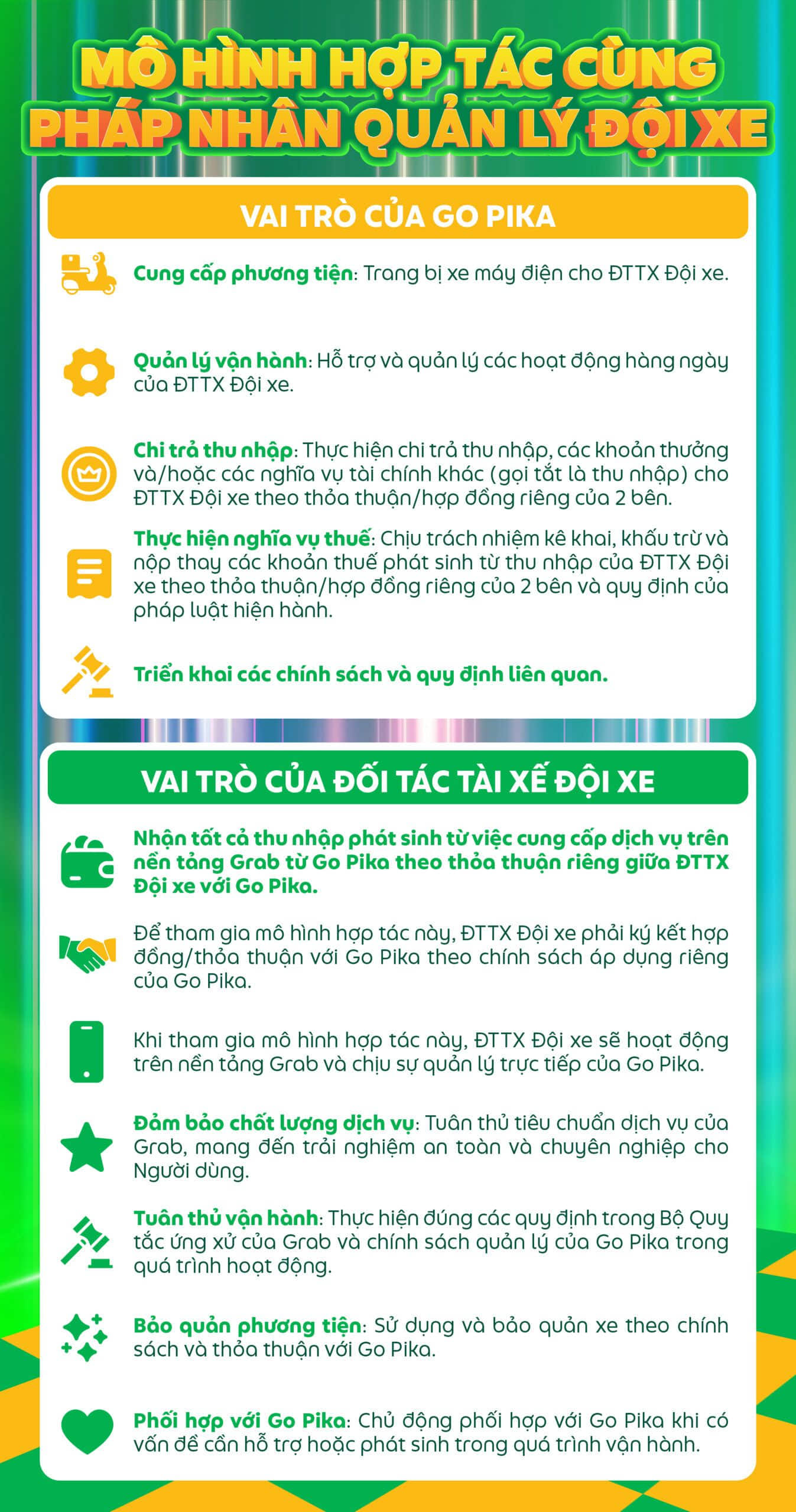 Grab xin giới thiệu một mô hình hoạt động mới. Theo đó, Pháp nhân Quản lý Đội xe Go Pika (“Go Pika”) là đối tác cùng tham gia hợp tác với Grab trong việc cung cấp phương tiện và quản lý vận hành xe máy điện cho các dịch vụ được cung cấp trên nền tảng Grab. Thông qua sự hợp tác này, Grab hướng đến việc giới thiệu đến các Đối tác Tài xế cơ hội tiếp cận mô hình hoạt động linh hoạt hơn.