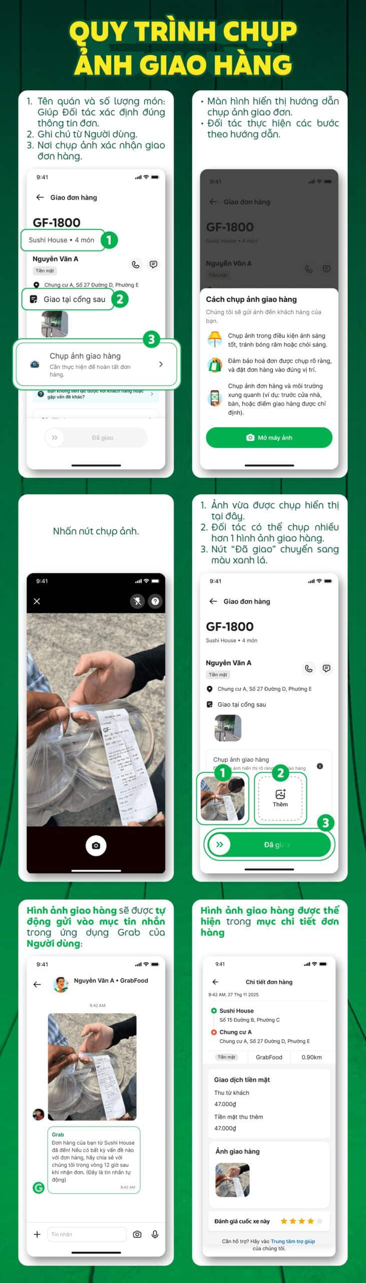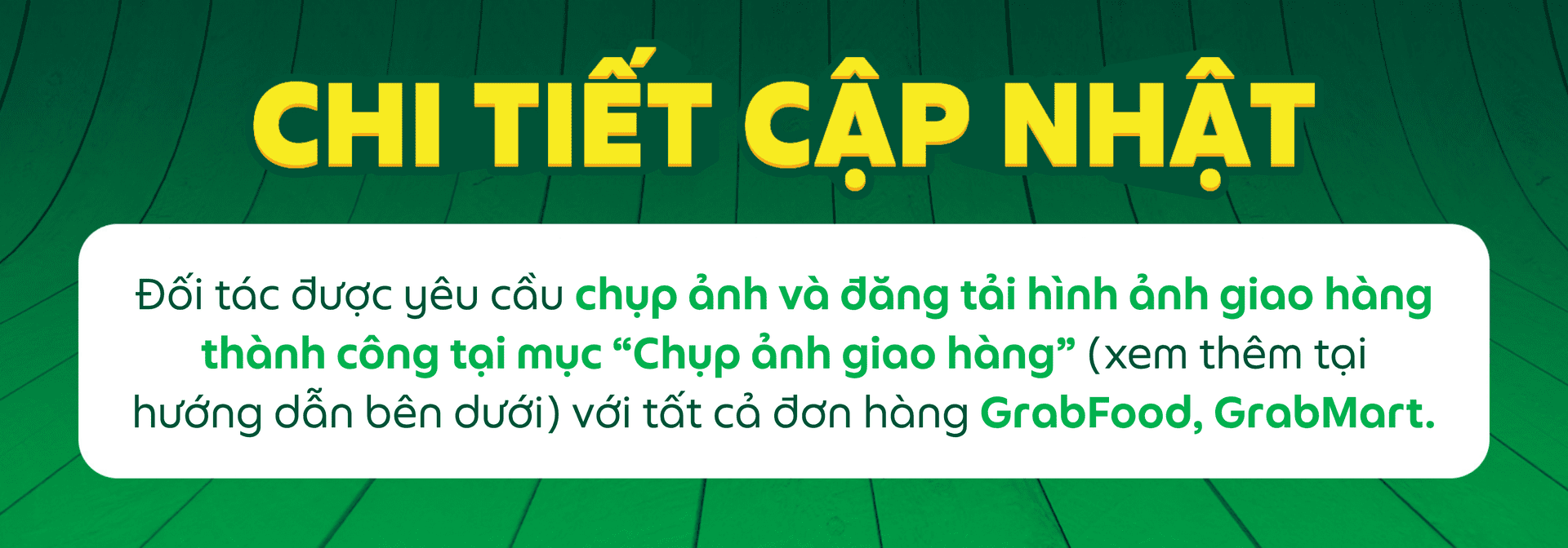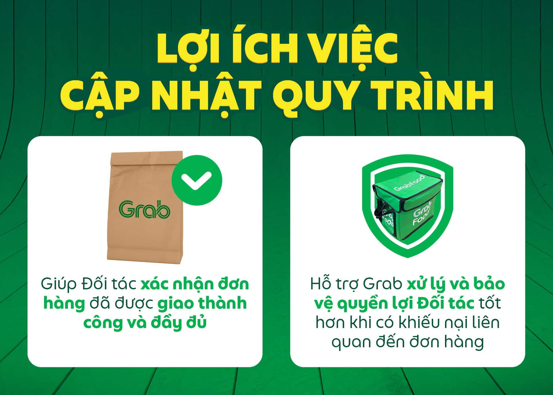 - Đây là thử nghiệm quy trình bắt buộc phải thực hiện. Grab khuyến khích Đối tác tuân thủ thử nghiệm quy trình chụp ảnh xác nhận giao đơn hàng để đảm bảo quyền lợi và nhận được hỗ trợ tốt hơn trong quá trình giải quyết tranh chấp (nếu có).