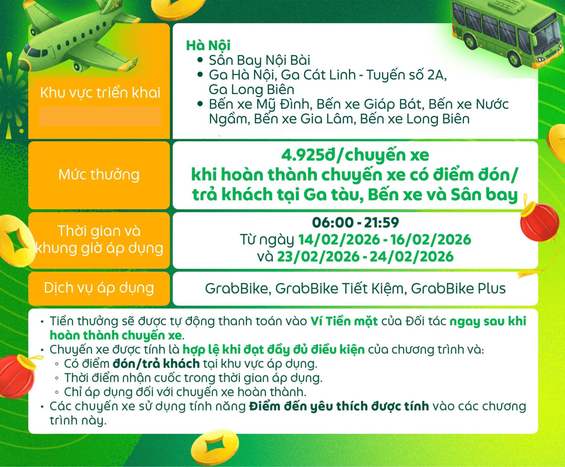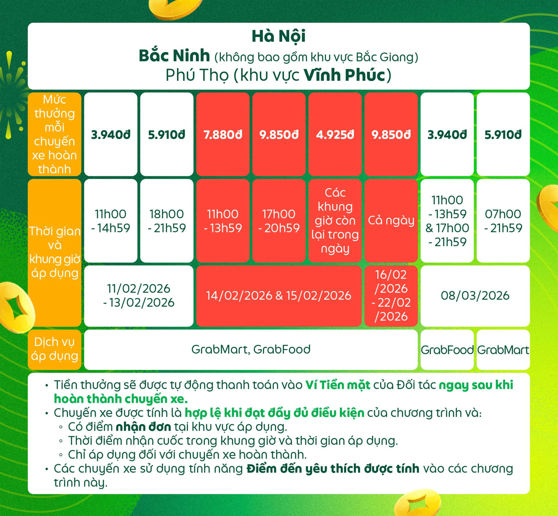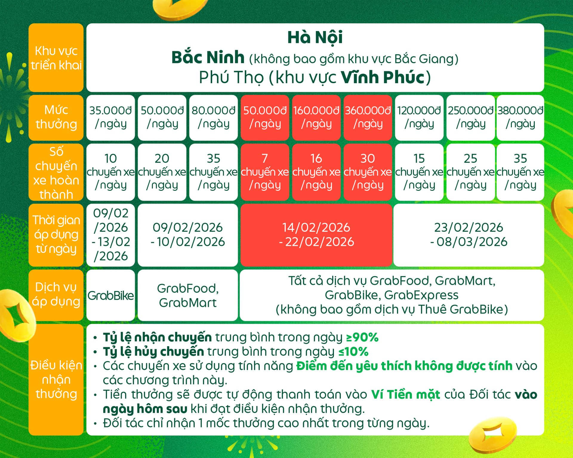 Mỗi chuyến xe an toàn, mỗi đơn hàng được giao đúng hẹn đều góp phần mang không khí Tết đến gần hơn với mọi nhà. Nhằm ghi nhận sự nỗ lực bền bỉ của Đối tác trong hành trình đồng hành cùng Grab, các chương trình thưởng Tết Bính Ngọ được triển khai, mở ra nhiều cơ hội gia tăng thu nhập trong mùa cao điểm sắp tới.
