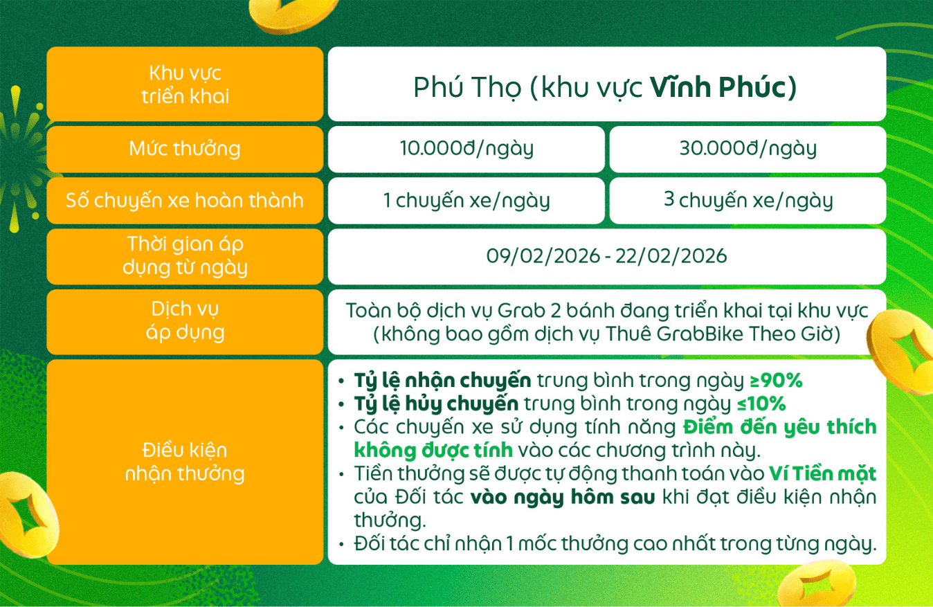 Các điều kiện của chương trình có thể thay đổi và sẽ được thông báo đến Đối tác, Grab có toàn quyền quyết định điều kiện và mức thưởng cuối cùng.