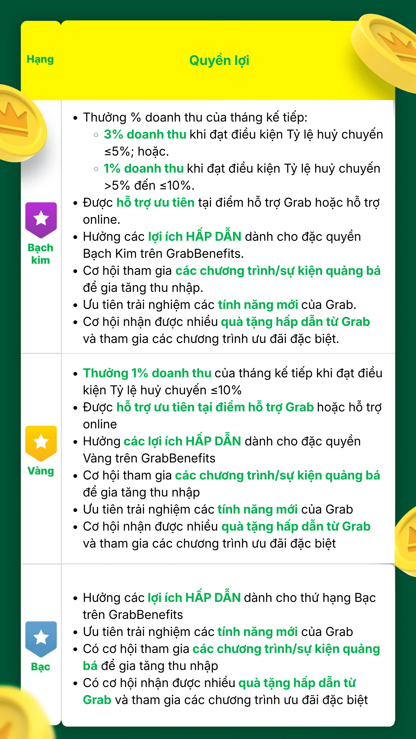 Thời gian áp dụng: từ ngày 01/12/2025 (dựa trên số chuyến xe hoàn thành và số giờ hoạt động tháng trước đó (Tháng 11/2025 dùng để xét hạng thành tích cho tháng hiện tại (Tháng 12/2025)) cho đến khi có thông báo mới.