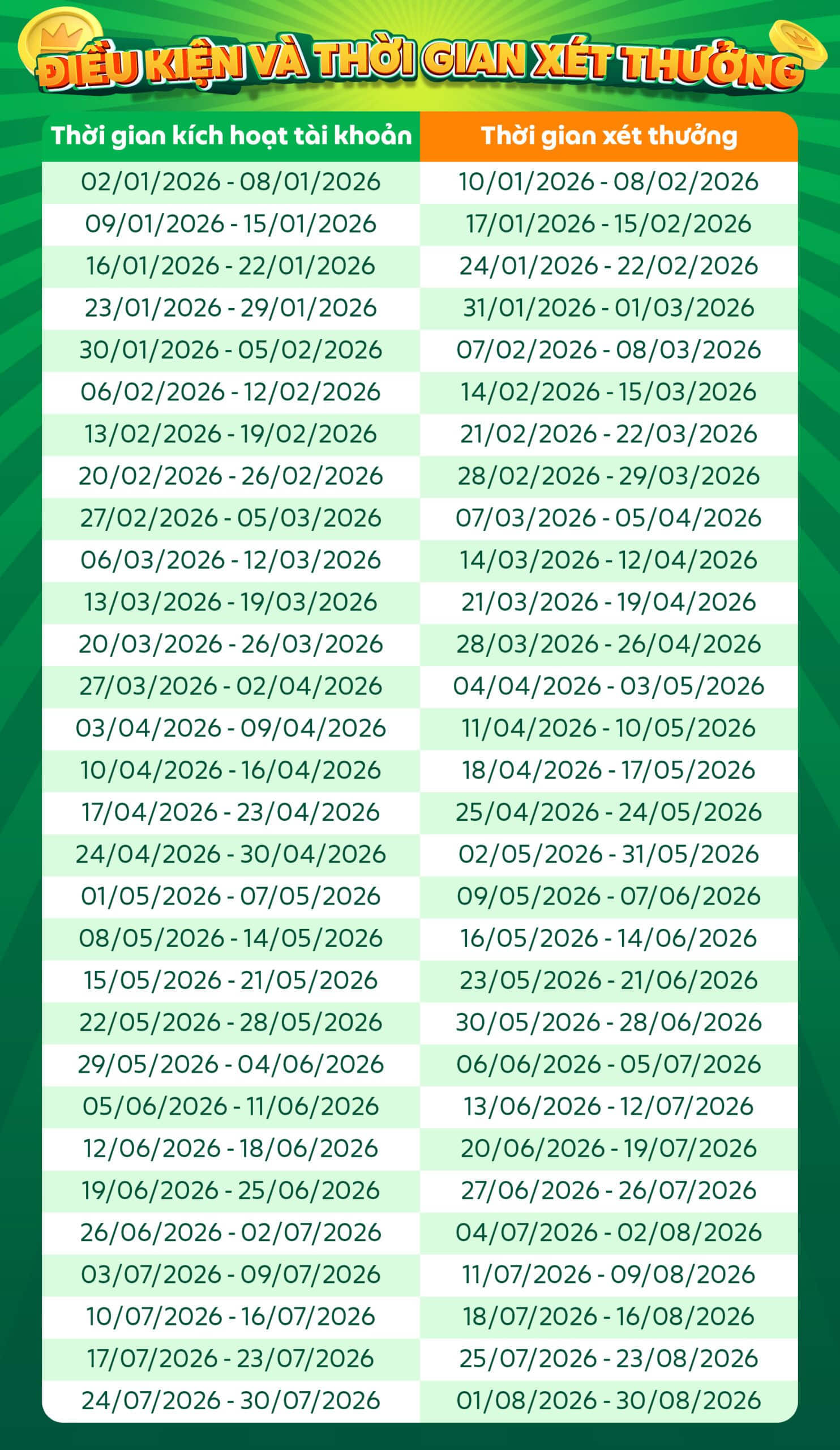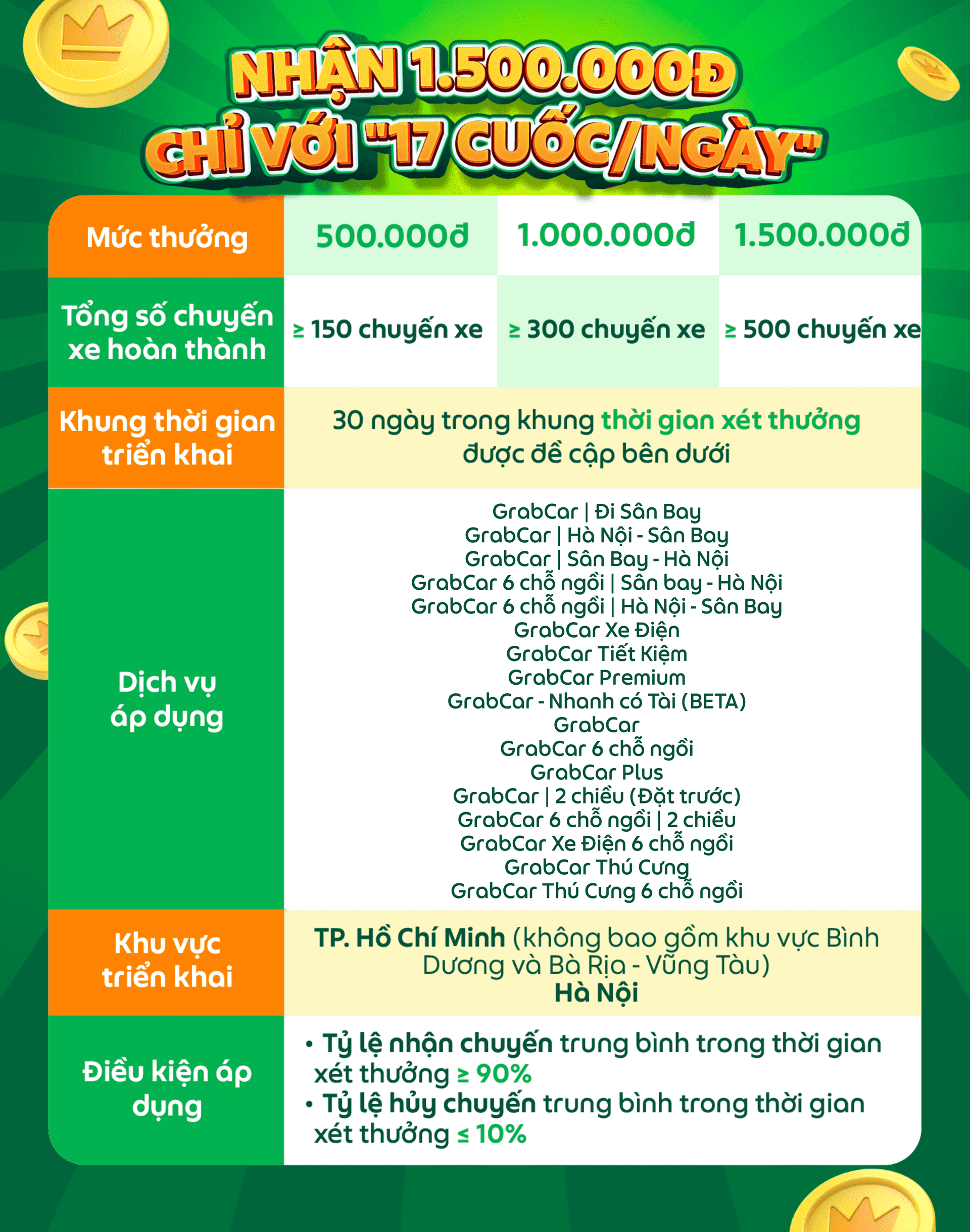 Số chuyến xe mà Đối tác hoàn thành phải nằm trong thời gian xét thưởng và tài khoản Grab Driver của Đối tác phải được kích hoạt trong mốc thời gian tương ứng như quy định tại bảng “ĐIỀU KIỆN VÀ THỜI GIAN XÉT THƯỞNG” trên. Nếu Đối tác kích hoạt tài khoản, nhưng không thực hiện chuyến xe trong thời gian xét thưởng tương ứng, mà thực hiện chuyến xe ở giai đoạn xét thưởng khác thì kết quả sẽ được tính là KHÔNG HỢP LỆ.