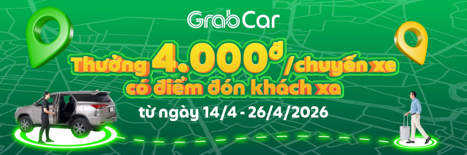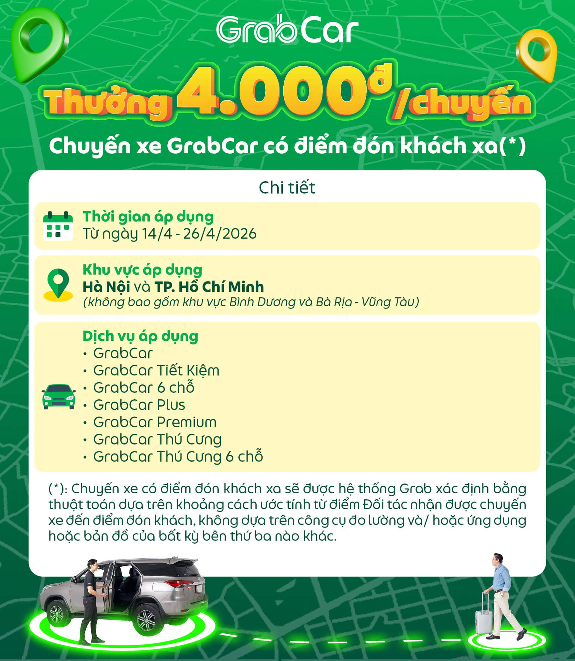 Grab triển khai chương trình thưởng dành cho các chuyến xe GrabCar có điểm đón khách xa, giúp Đối tác tăng thêm thu nhập khi hoàn thành chuyến.
