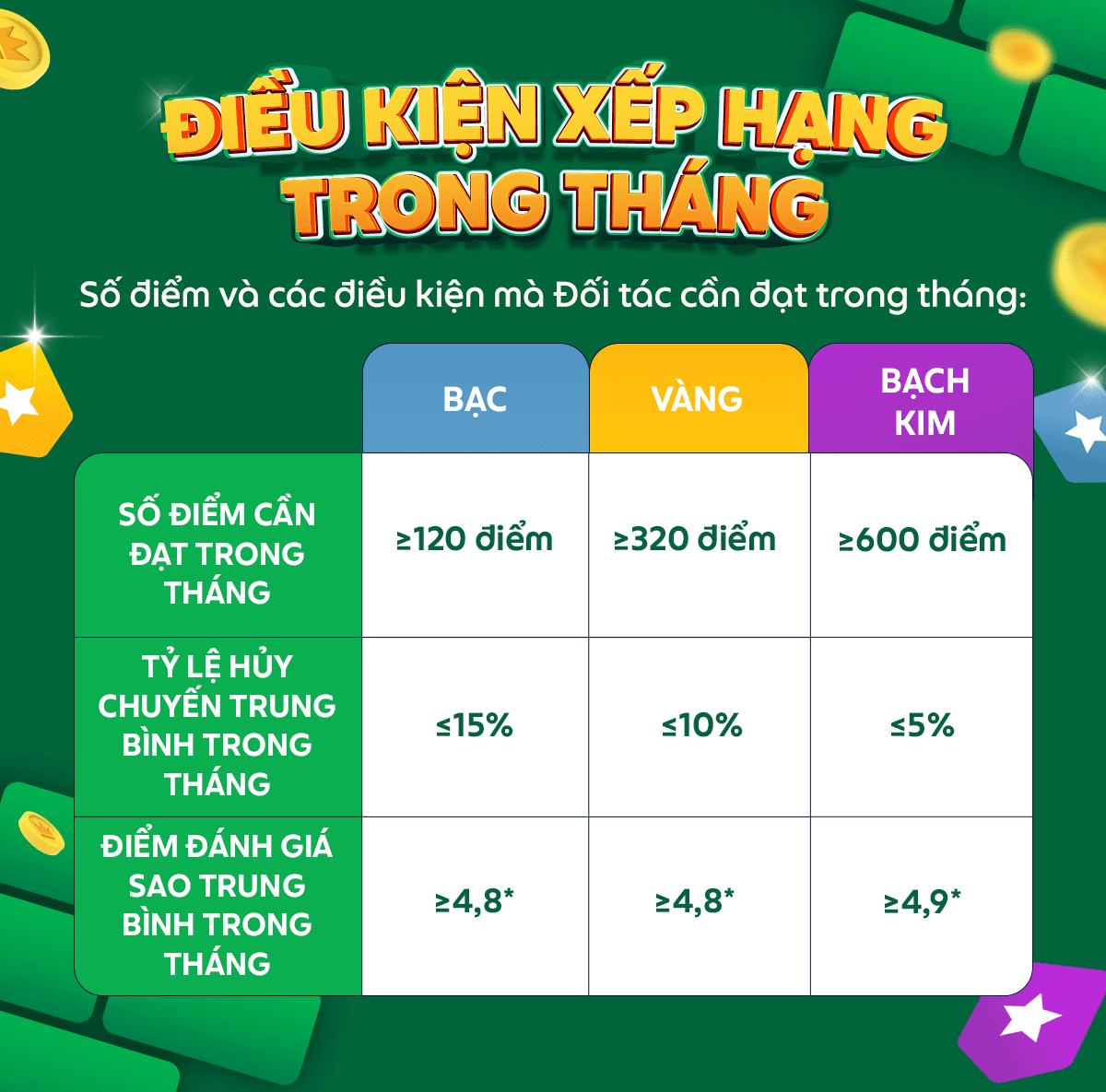 Thứ hạng chính xác của Đối tác sẽ được cập nhật trong ngày 07 hàng tháng (không bao gồm các ngày Thứ 7, Chủ Nhật và lễ, Tết). |