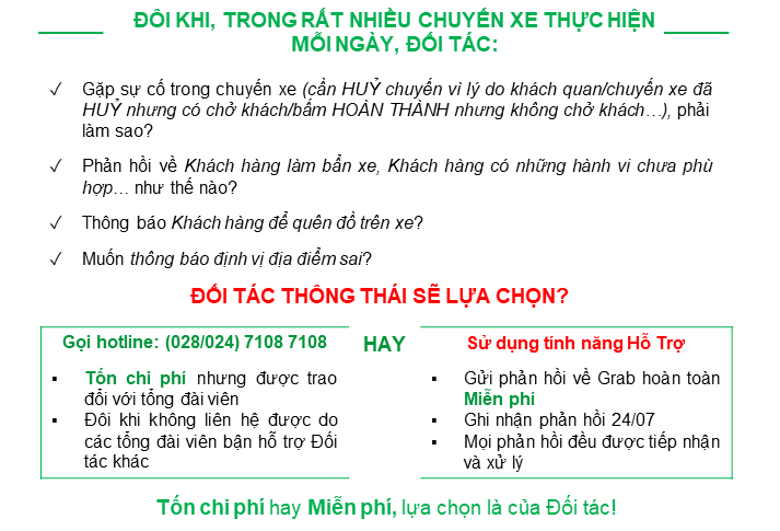 Với Đối tác cũ, tính năng Hỗ trợ với Thông tin nổi bật trong ngày, các thông tin về thanh toán, Top Up – Nạp tiền (khiếu nại về thanh toán và chương trình thưởng, thắc mắc thời gian nhận tiền rút từ Ví Tiền mặt, lịch Top Up – Nạp tiền, hướng dẫn Top Up – Nạp tiền qua các hình thức Ví tiền mặt – Ngân hàng – Momo, yêu cầu kiểm tra khi có sai lệch trong Top Up – Nạp tiền…) chắc chắn sẽ giúp quá trình hoạt động GrabCar của Đối tác luôn thuận lợi và suôn sẻ.