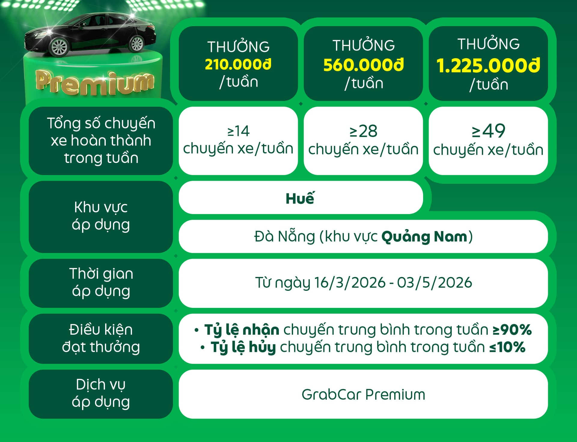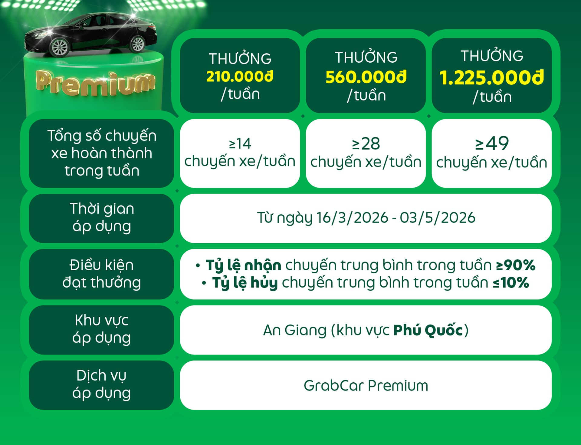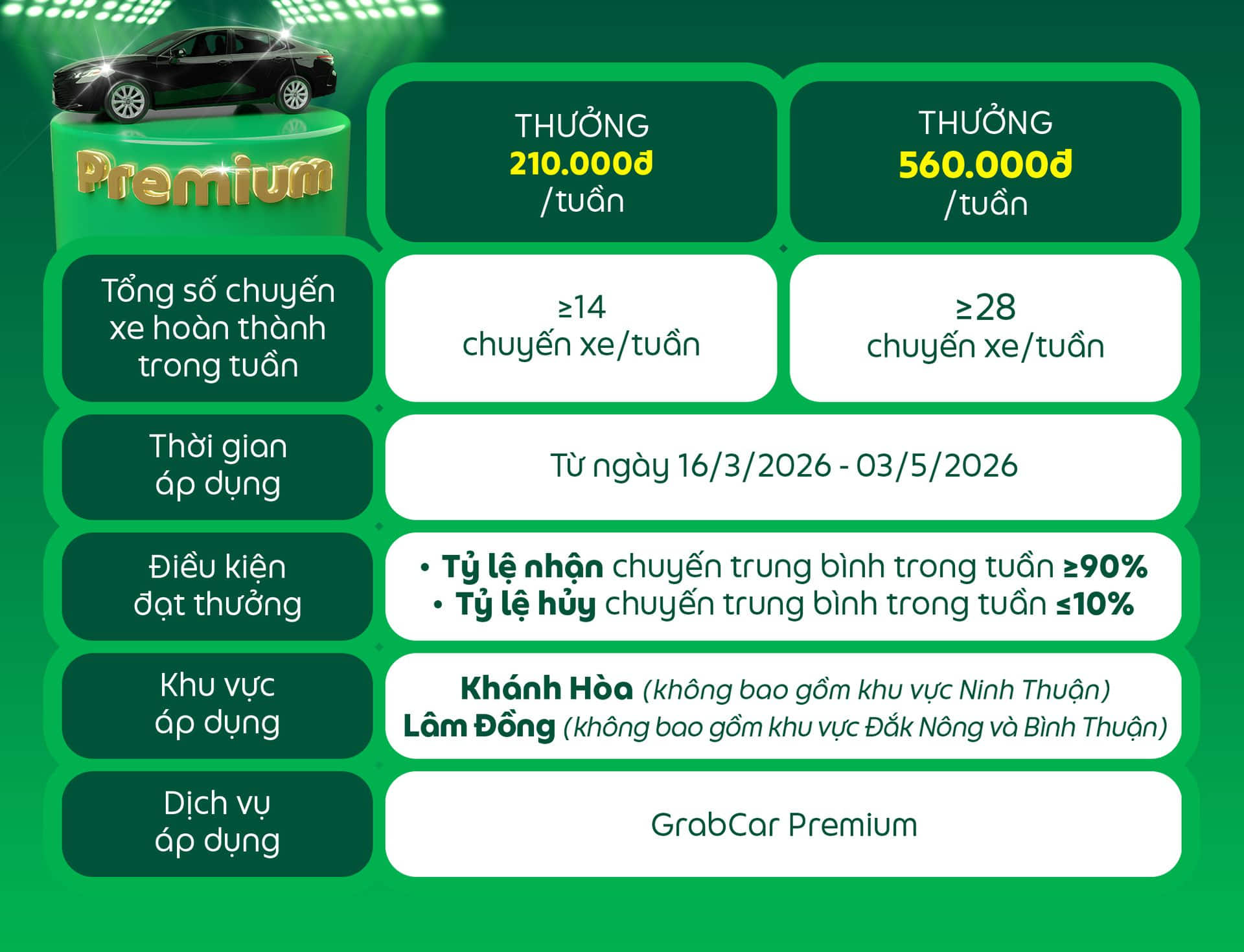 Với mong muốn tạo thêm cơ hội gia tăng thu nhập cho Đối tác khi hoạt động dịch vụ GrabCar Premium, Grab thông báo triển khai chương trình thưởng mỗi tuần với chi tiết như sau: