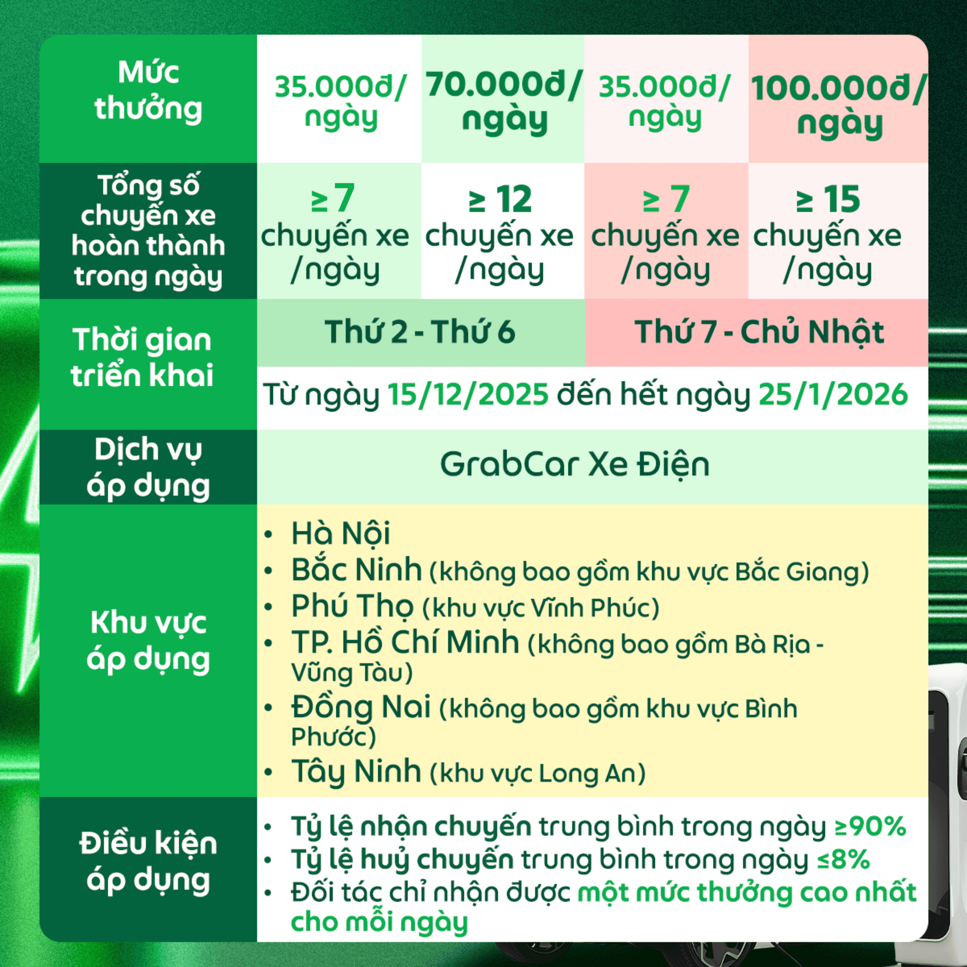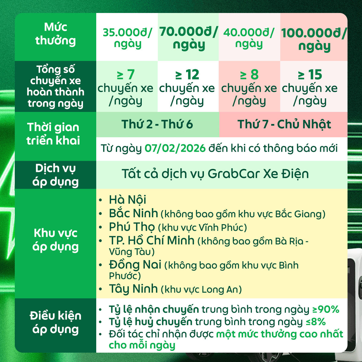 Mỗi ngày ra xe và hoàn thành chuyến xe GrabCar Xe Điện, Đối tác không chỉ có thêm thu nhập mà còn có cơ hội nhận thưởng lên đến 100.000đ. Cùng xem chi tiết nhé!