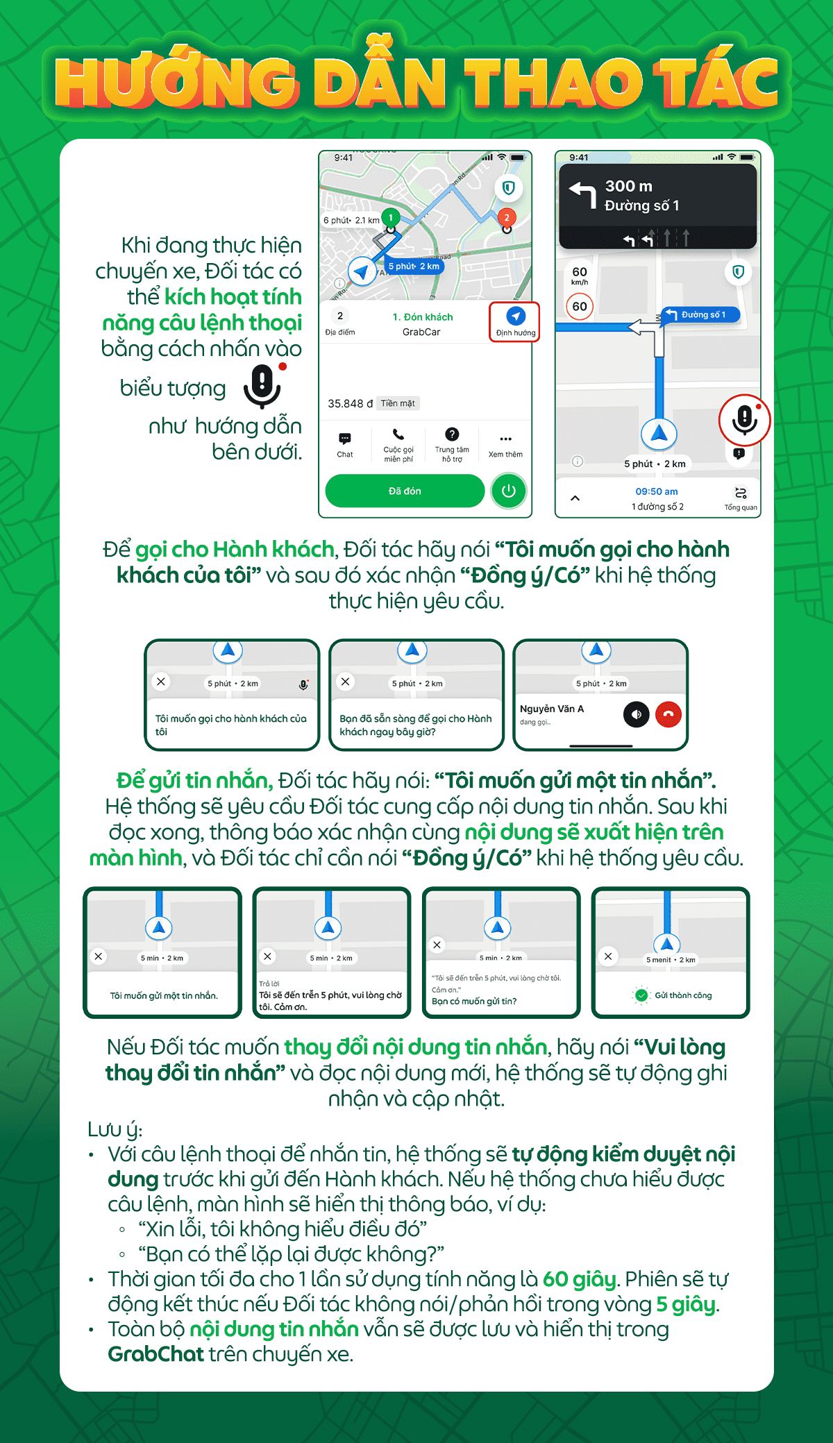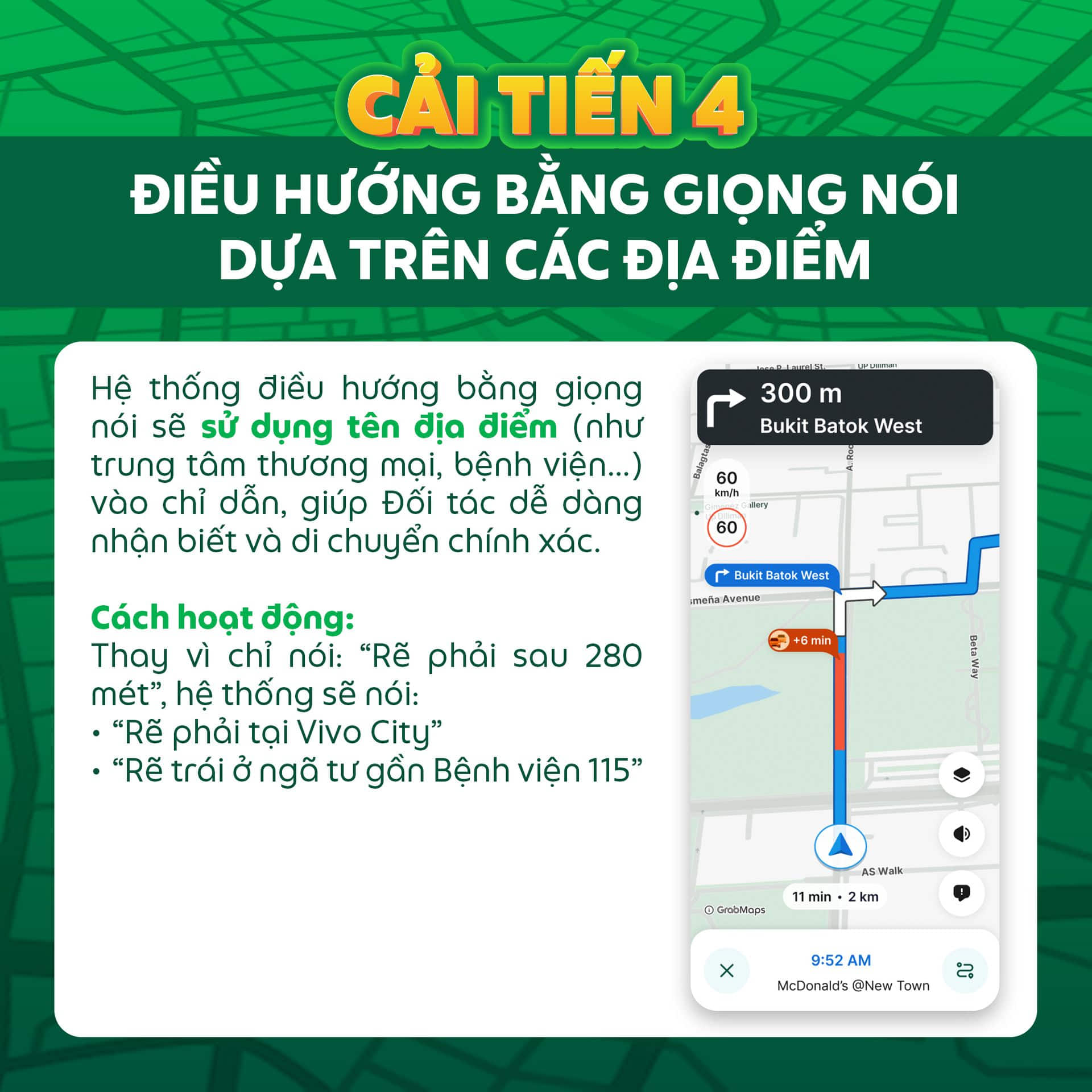 Với các cải tiến mới của Grab điều hướng, Đối tác có thể sử dụng câu lệnh thoại bằng giọng nói để hệ thống tự động hỗ trợ liên hệ hoặc nhắn tin với Hành khách. Nhờ đó, Đối tác không cần thực hiện nhiều thao tác khi đang lái xe, giúp hành trình trở nên an toàn và thuận tiện hơn.