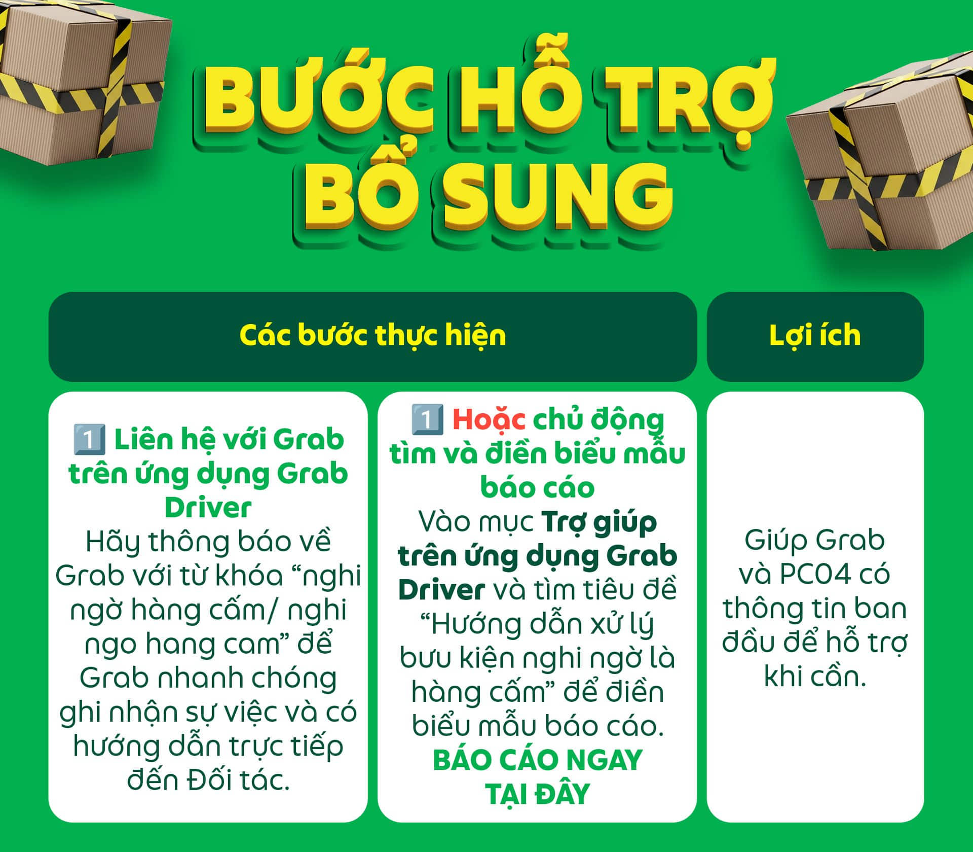 An toàn của Đối tác luôn là ưu tiên hàng đầu của Grab. Chúng tôi hiểu rằng khi phát hiện/ nghi ngờ bưu kiện có dấu hiệu bất thường, Đối tác có thể cảm thấy lo lắng hoặc áp lực trong quá trình trình báo.