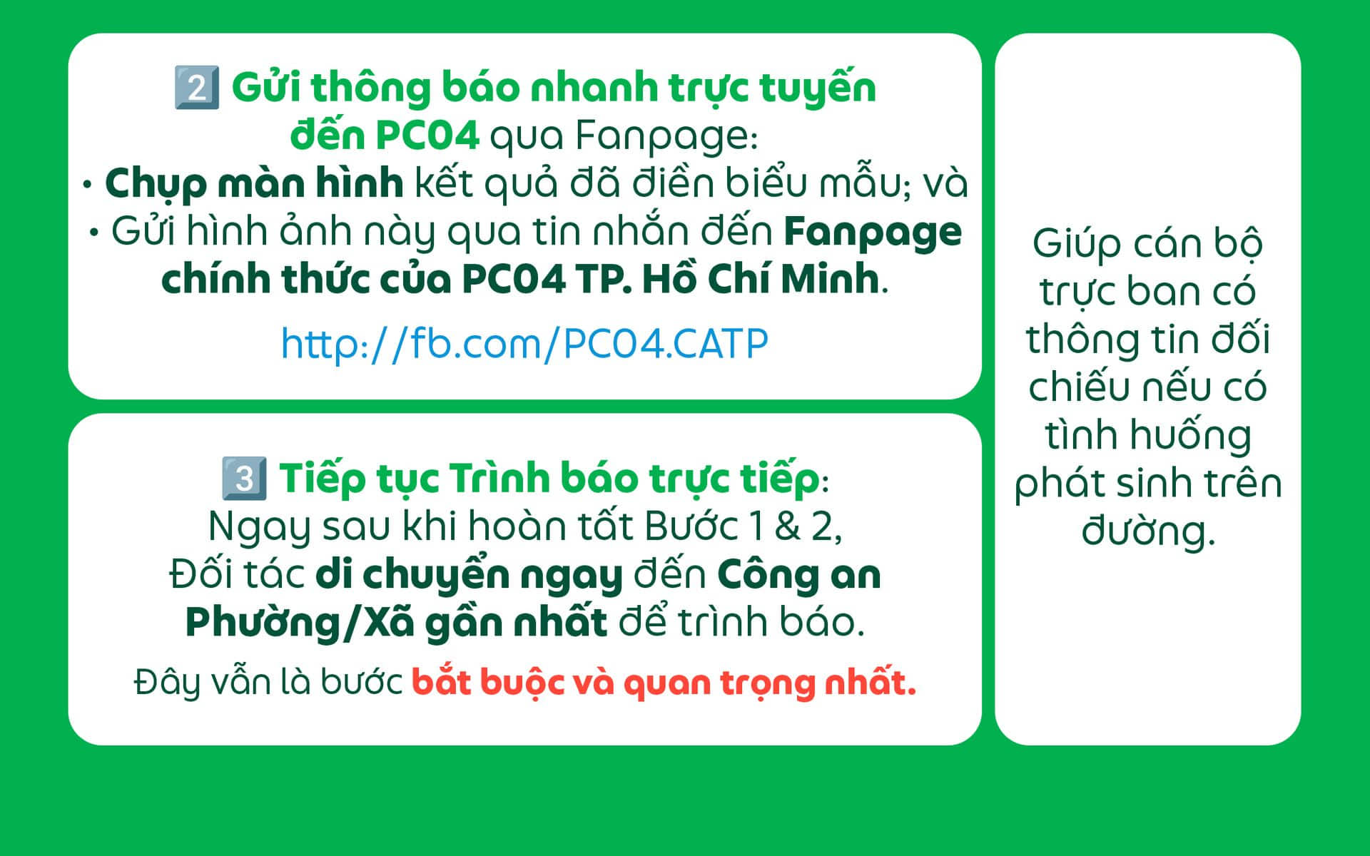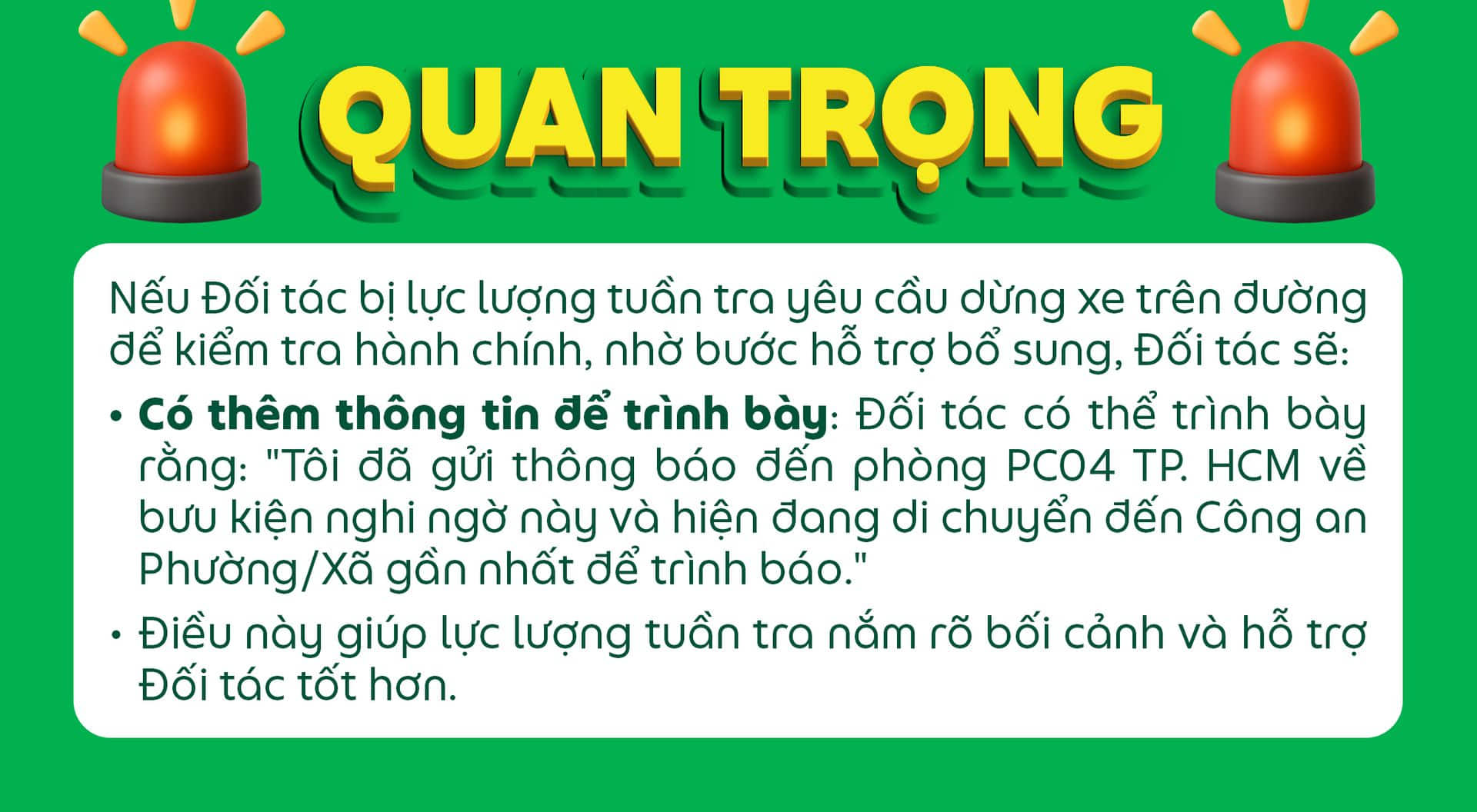 Nhằm tăng cường sự hỗ trợ và bảo vệ cho Đối tác trong quá trình di chuyển đến cơ quan chức năng, Grab đã phối hợp với Phòng Cảnh sát Điều tra Tội phạm về Ma túy (PC04) – Công an TP. Hồ Chí Minh để bổ sung một bước hỗ trợ, giúp Đối tác yên tâm hơn trong lúc di chuyển đến cơ quan chức năng.