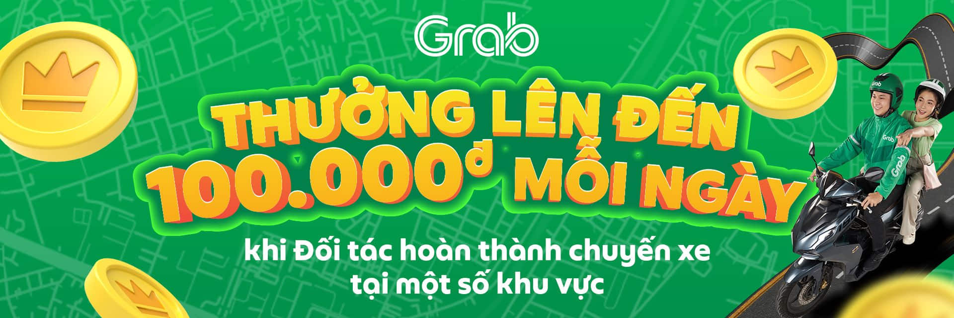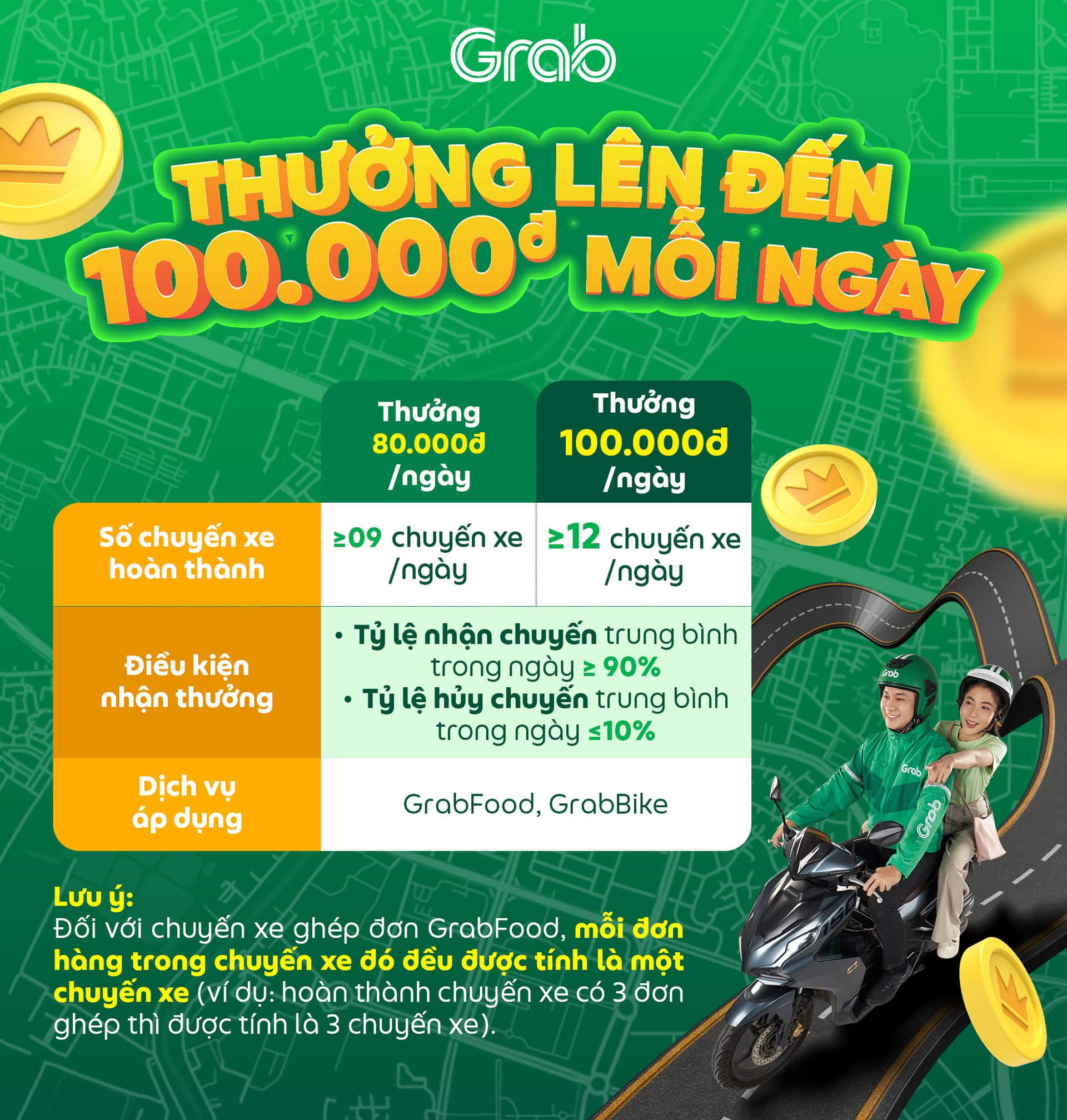 Grab triển khai chương trình thưởng lên đến 100.000đ mỗi ngày khi Đối tác hoàn thành chuyến xe, cụ thể như sau:
