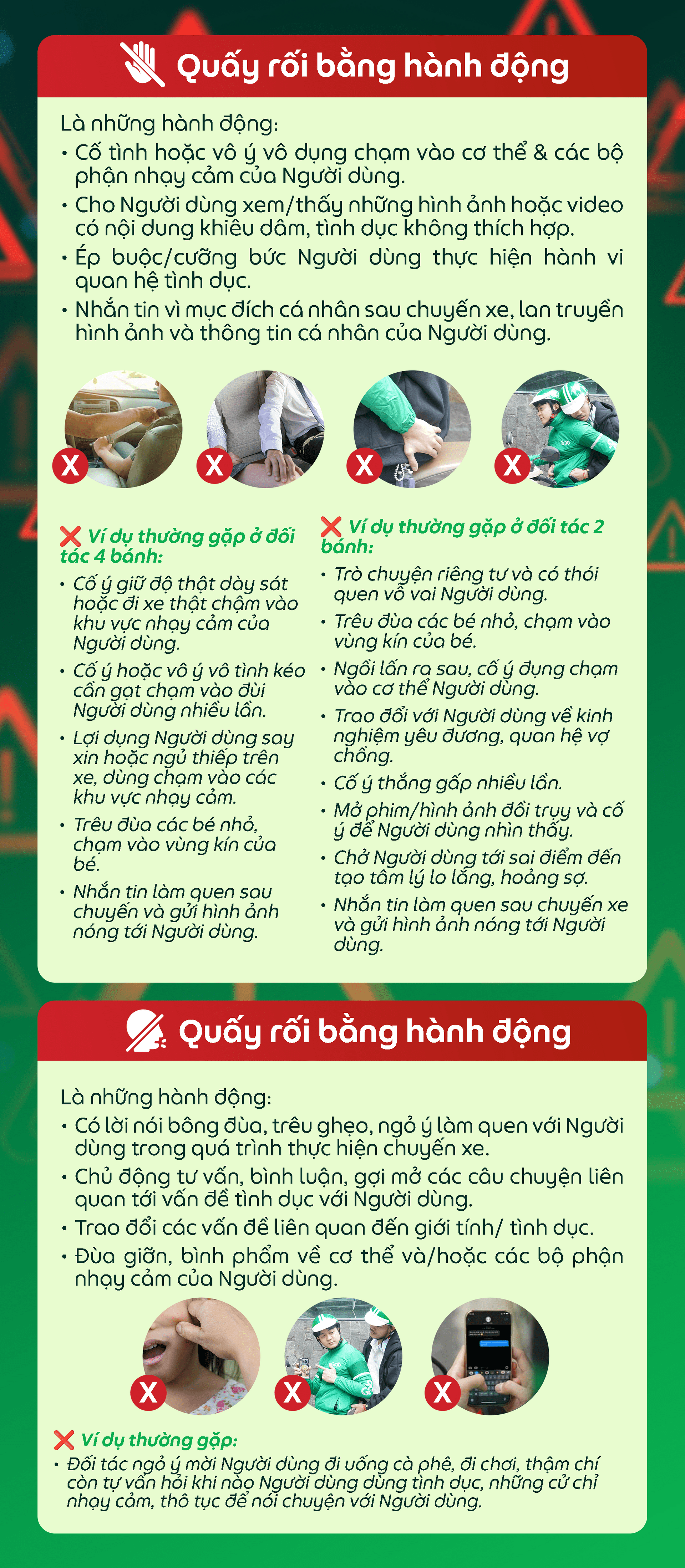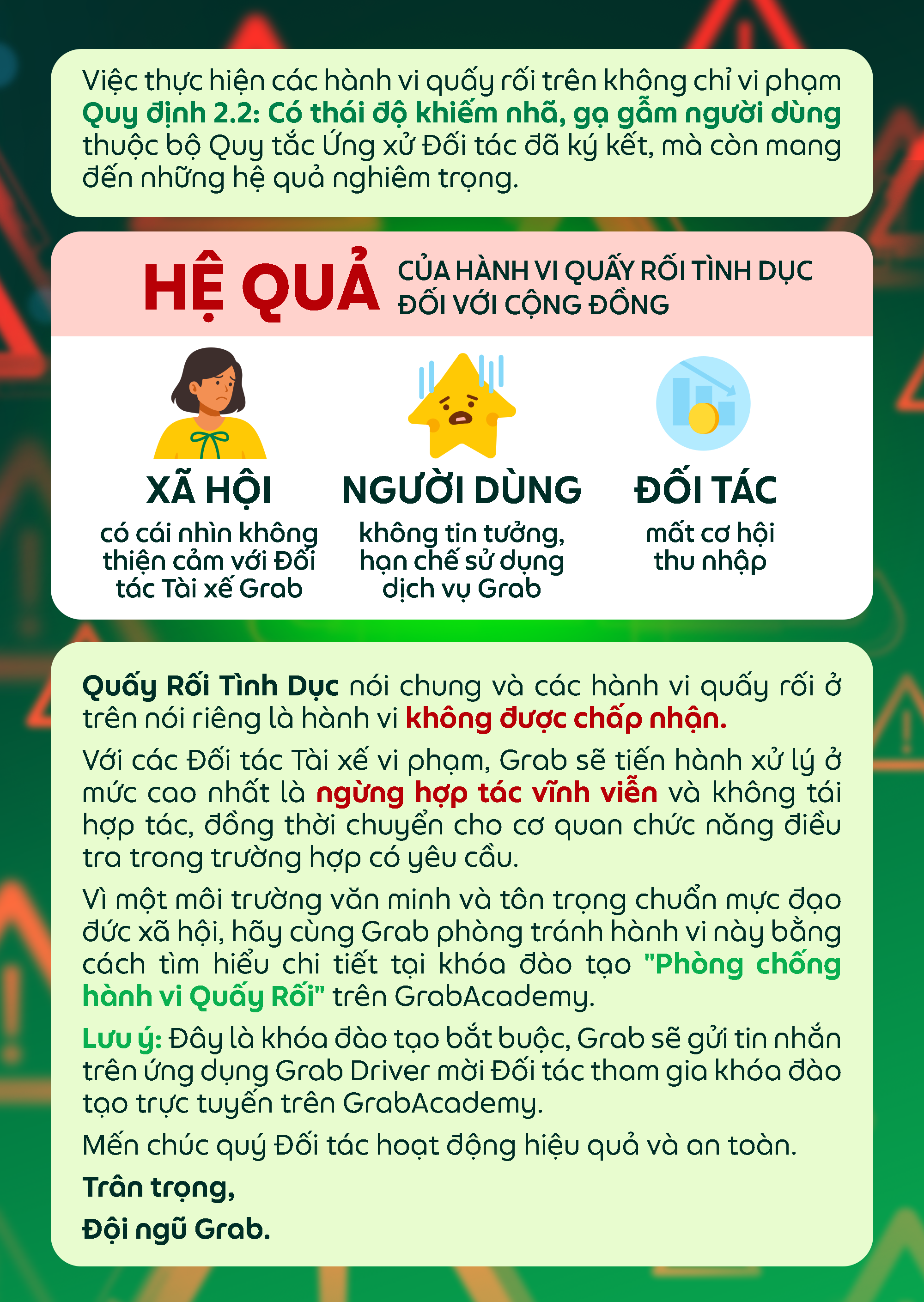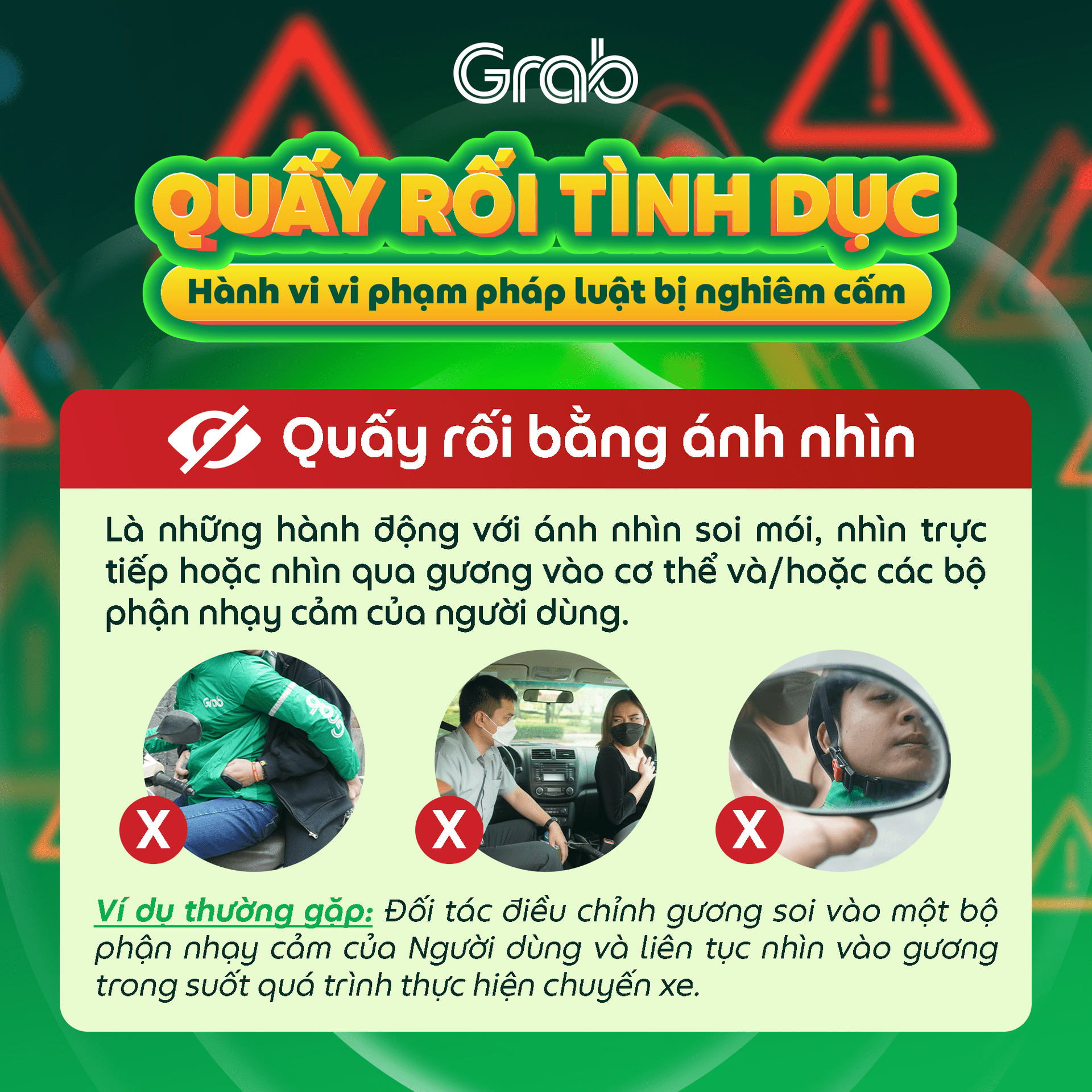 Hành vi quấy rối tình dục nói chung và các hành vi Quấy rối bằng ánh nhìn/ Quấy rối bằng lời nói/ Quấy rối bằng hành động nói riêng không chỉ là hành vi vi phạm pháp luật, xã hội lên án mà còn vi phạm quy định trong bộ Quy tắc ứng xử mà Đối tác đã ký kết. Vậy các hành vi được đề cập ở trên xảy ra như thế nào trong quá trình hoạt động của Đối tác Grab?